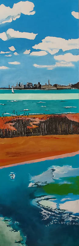 10" x 30" x 1.5", original gallery wrap, acrylics on canvas, showing a view of Lake Michigan, from Evanston, on the shores of Northwestern University. Clouds are reflected in the pond in the foreground and the Chicago skyline is seen in the distance. By Janet Latshaw Simons. Signed as Latshaw. Stylized realism.