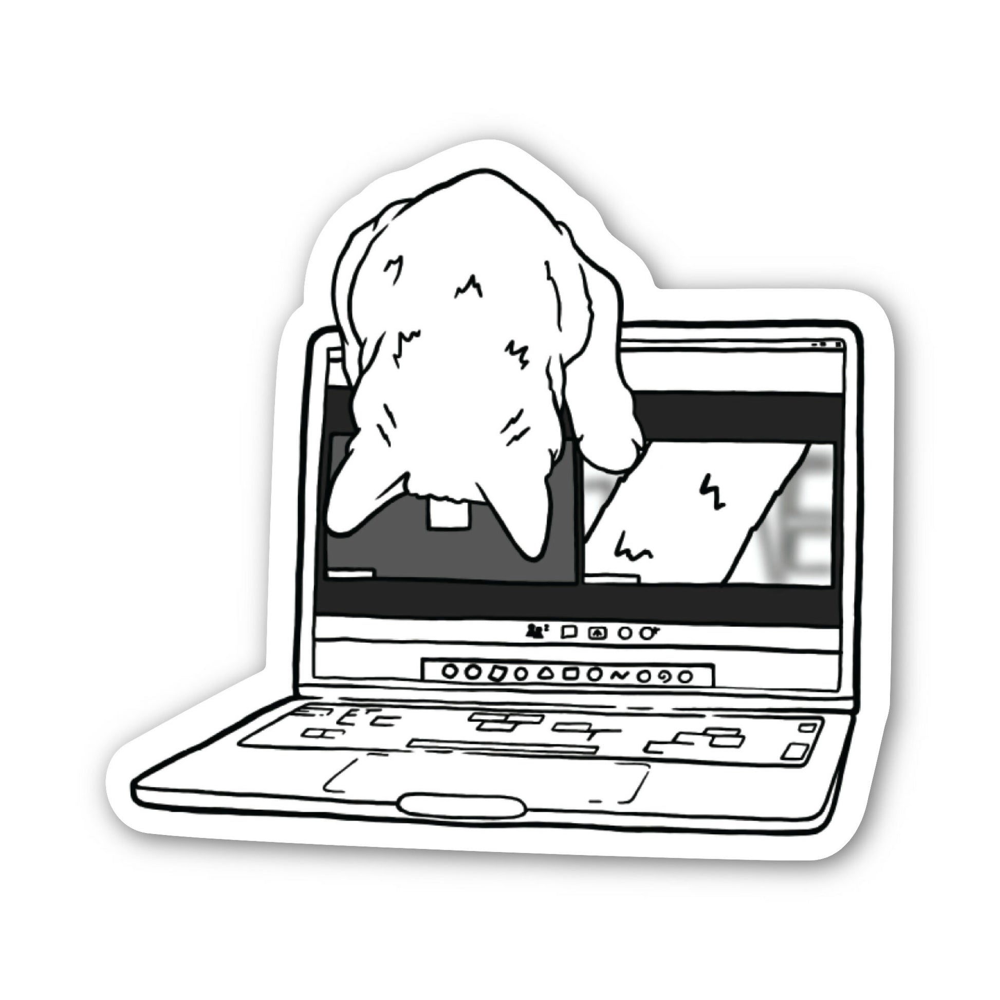 A sticker of a digitally hand-drawn cat introducing themself on a zoom call.