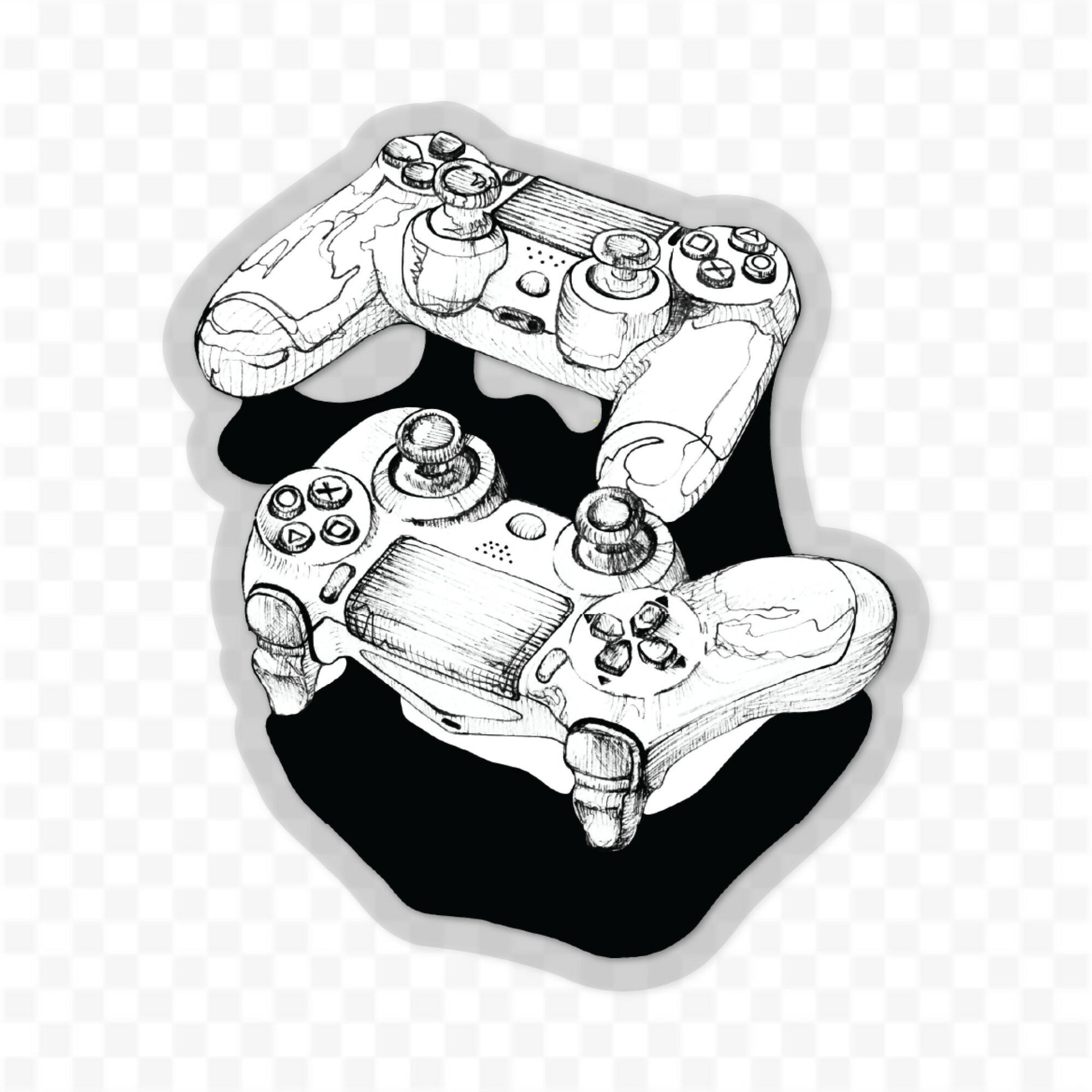 A transparent sticker of a hand-drawn semi-continuous line drawing of a couple of gaming controllers.