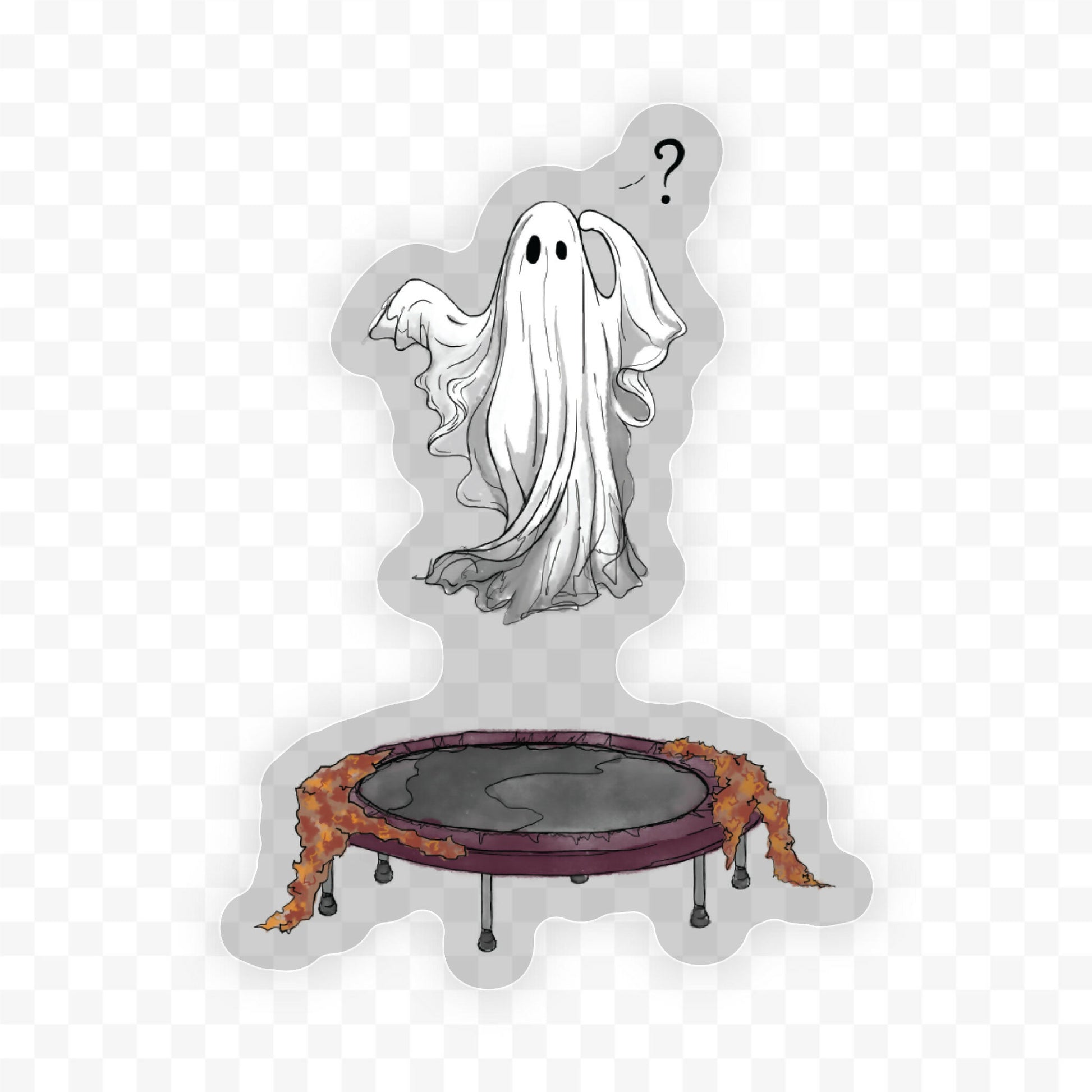 A transparent sticker of a digitally hand-drawn line drawing with semi-continuous elements of a ghost trying out a trampoline.
