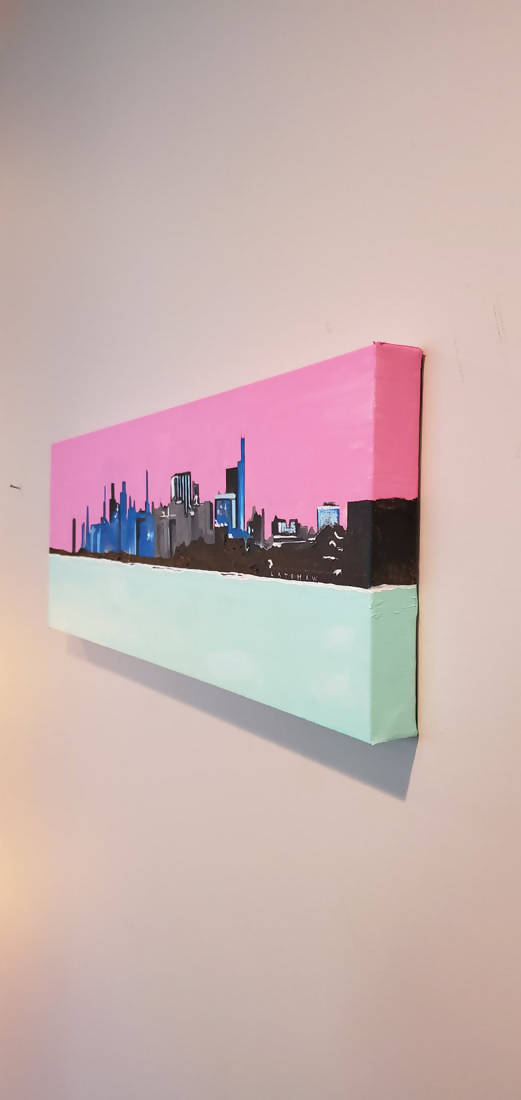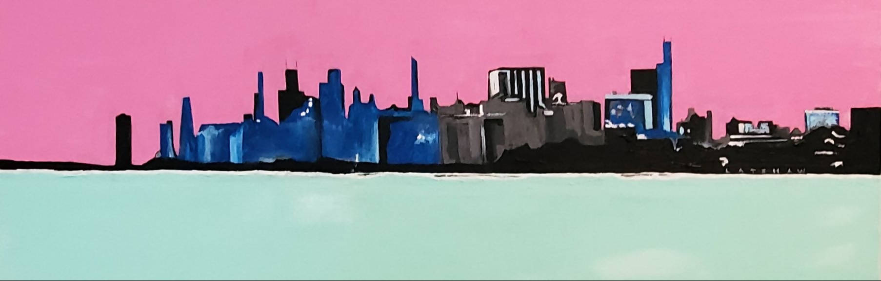 30" x 10" x 1.5", original gallery wrap, acrylics on canvas. This painting shows the Chicago skyline, as seen from the shores of the Northwestern University campus, in Evanston. The colors are enhanced and yet authentic. By Janet Latshaw Simons, Signed as Latshaw. Stylized realism.
