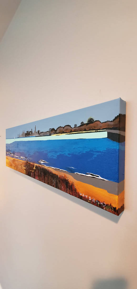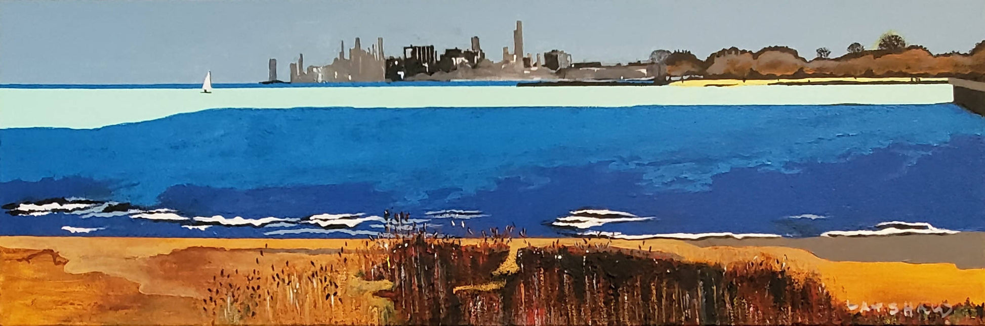 30" x 10" x 1.5", original gallery wrap, acrylics on canvas. This is an authentic scene of Lake Michigan, as viewed from the Northwestern University campus in Evanston, showing a mint green streak that appeared on the lake this day, with the Chicago skyline in the distance. By Janet Latshaw Simons. Signed as Latshaw. Stylized realism.