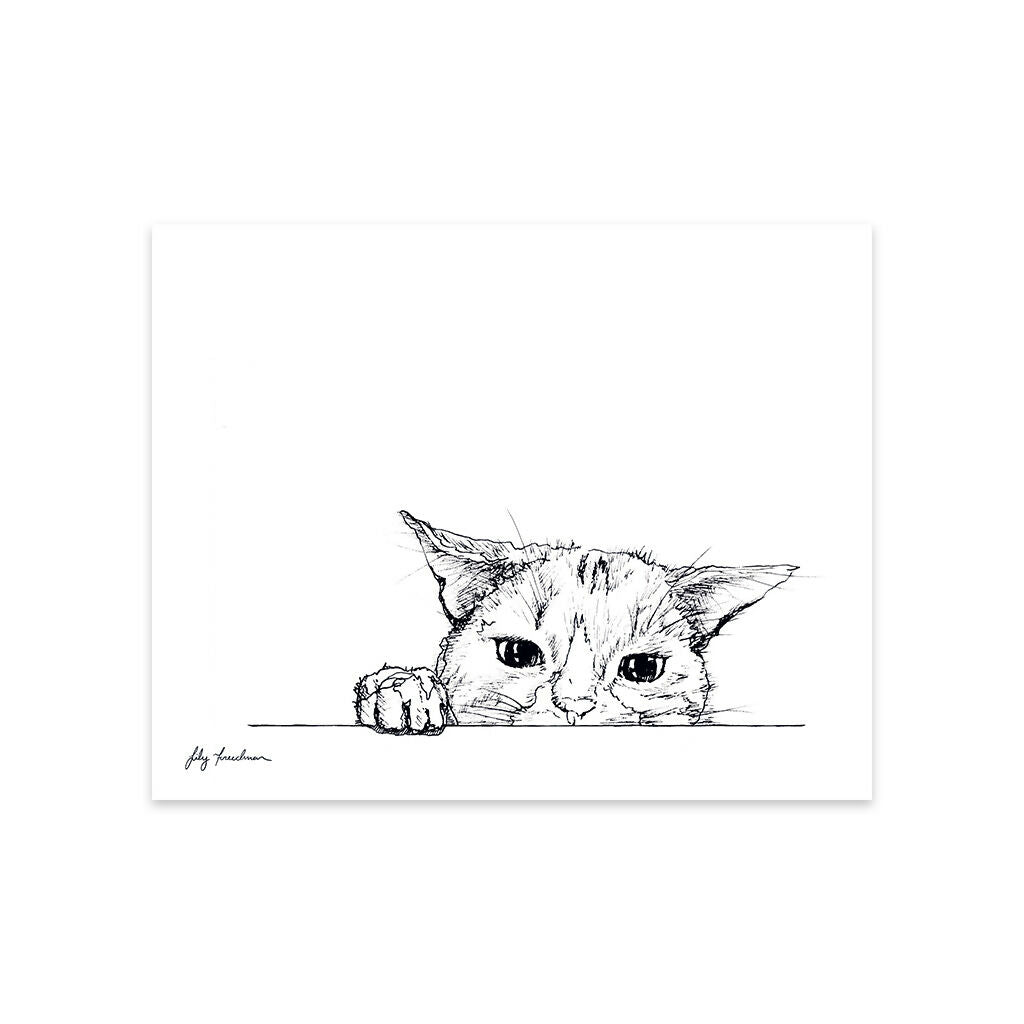 A hand-drawn semi-continuous line drawing art print of a curious cat ready to pounce. Hand-signed by the artist.