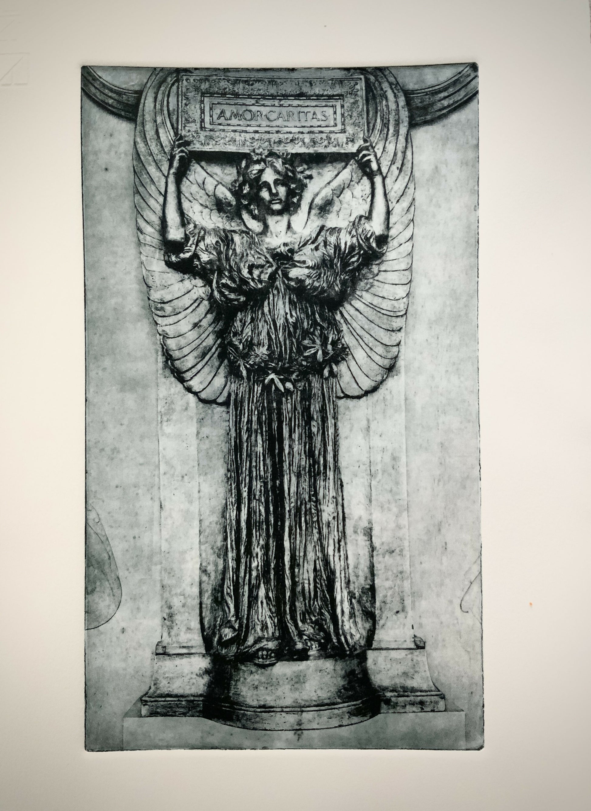 This etching is based on the winged, gilded bronze sculpture created by Augustus Saint-Gaudens, at the Metropolitan Museum. I photographed the 8.7 foot sculpture and adapted the image to create a 7x12 inch photopolymer intaglio etching printed on Hahnemuhle Copperplate Paper. Edition of 10. Available unframed.