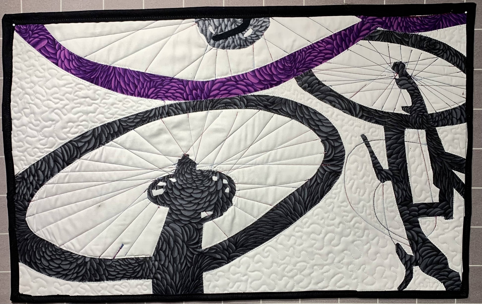 Bicycle shadow quilt - raw edge appliqué and free motion machine quilted - handmade in Evanston by Josh Chernoff. 15” by 23”