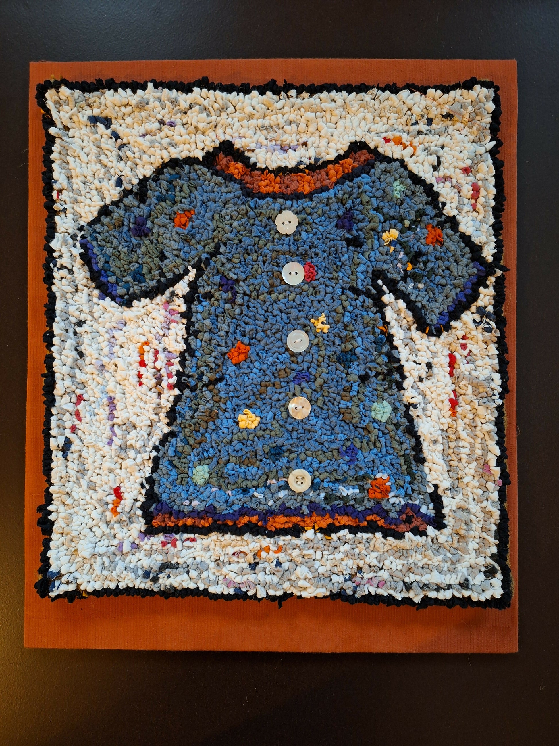 Hooked fabric piece on wood, ready to hang, 13 x 16 in