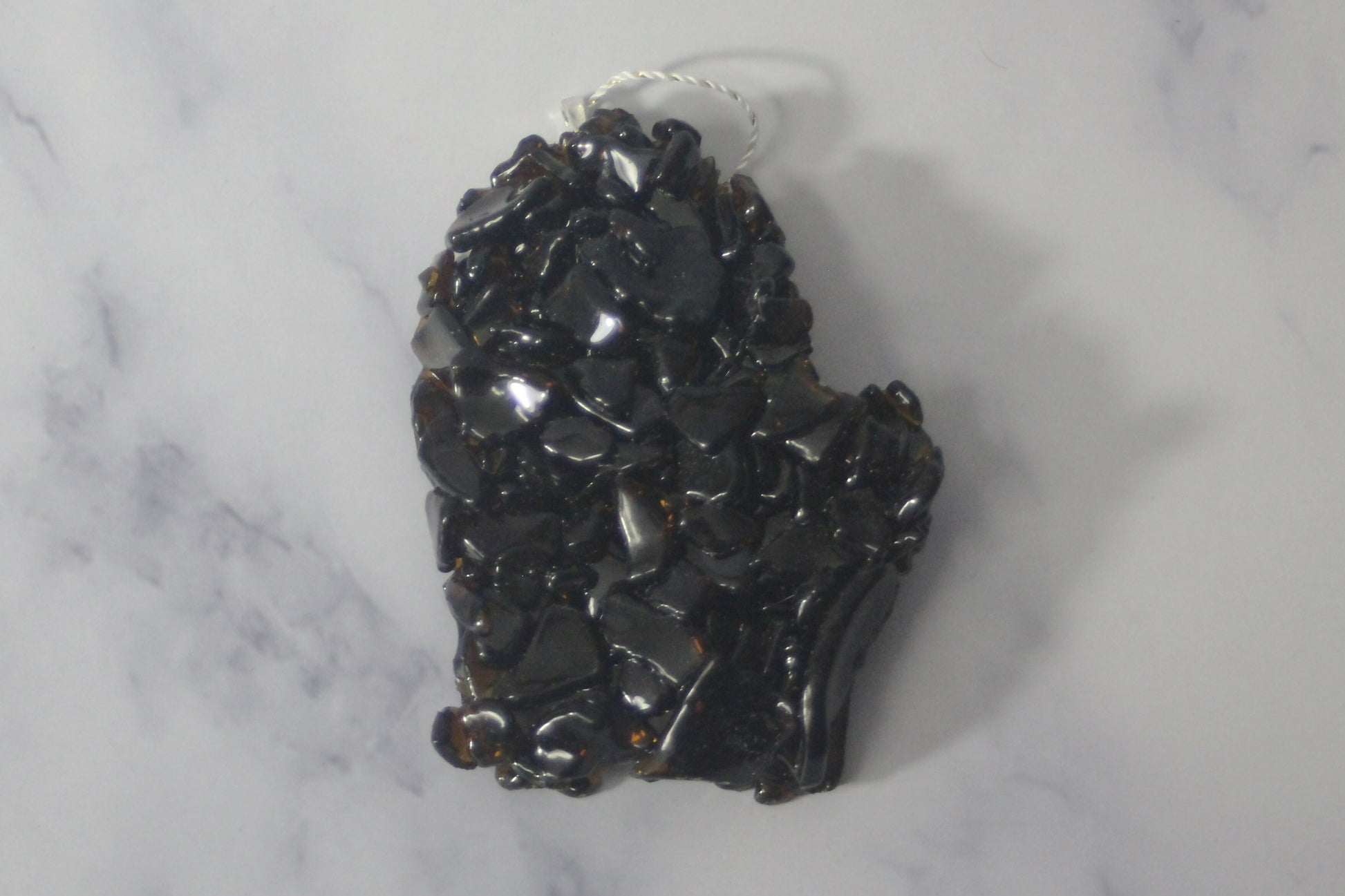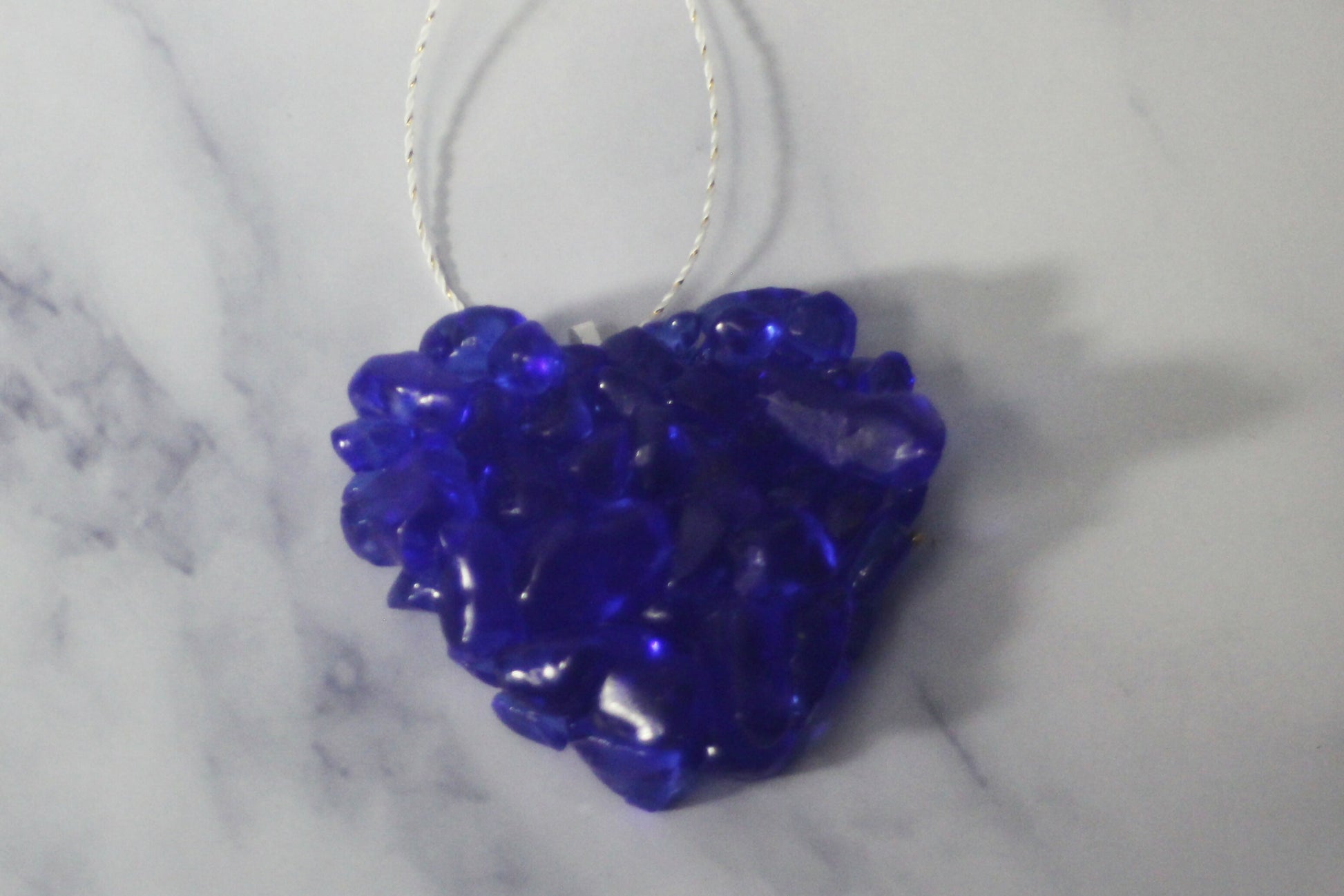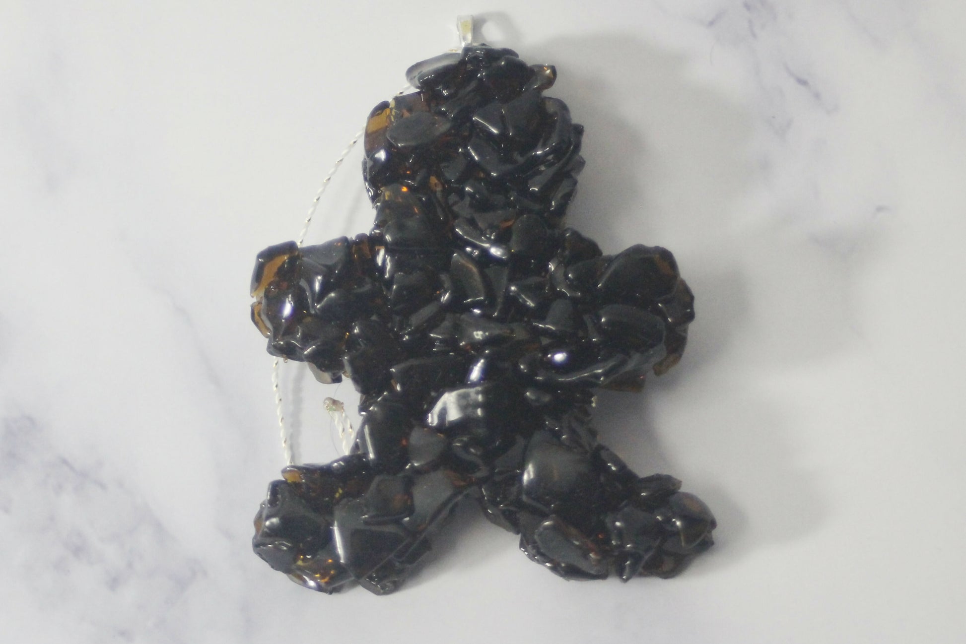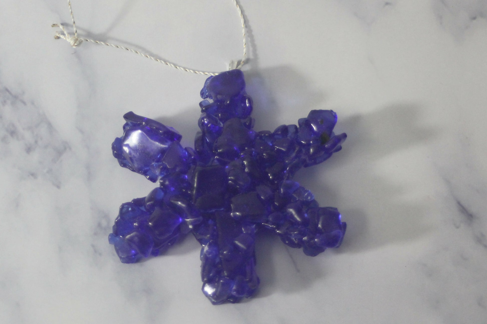 This ornament is made from bottle glass that has been crushed and kiln-fired into shape.