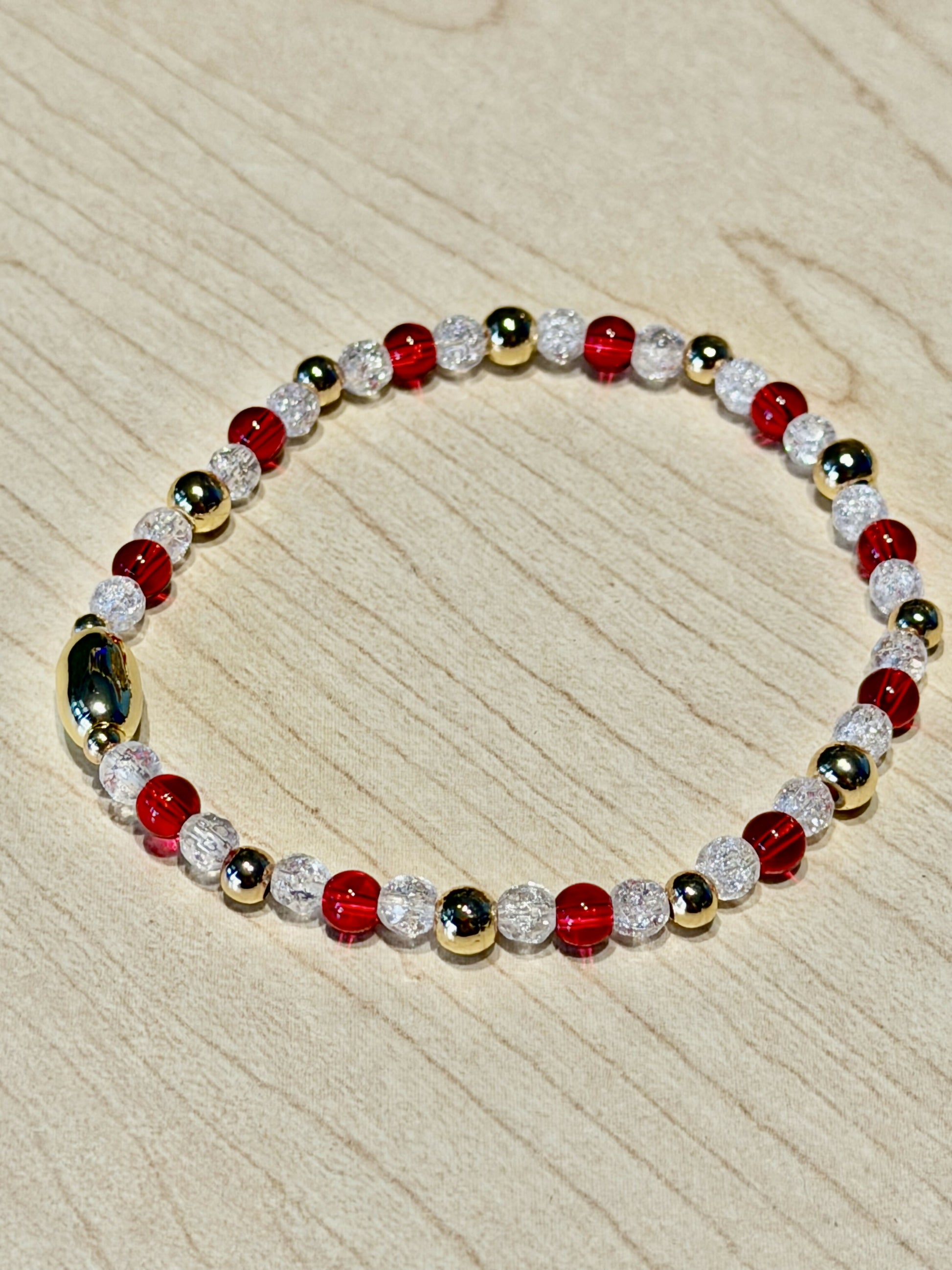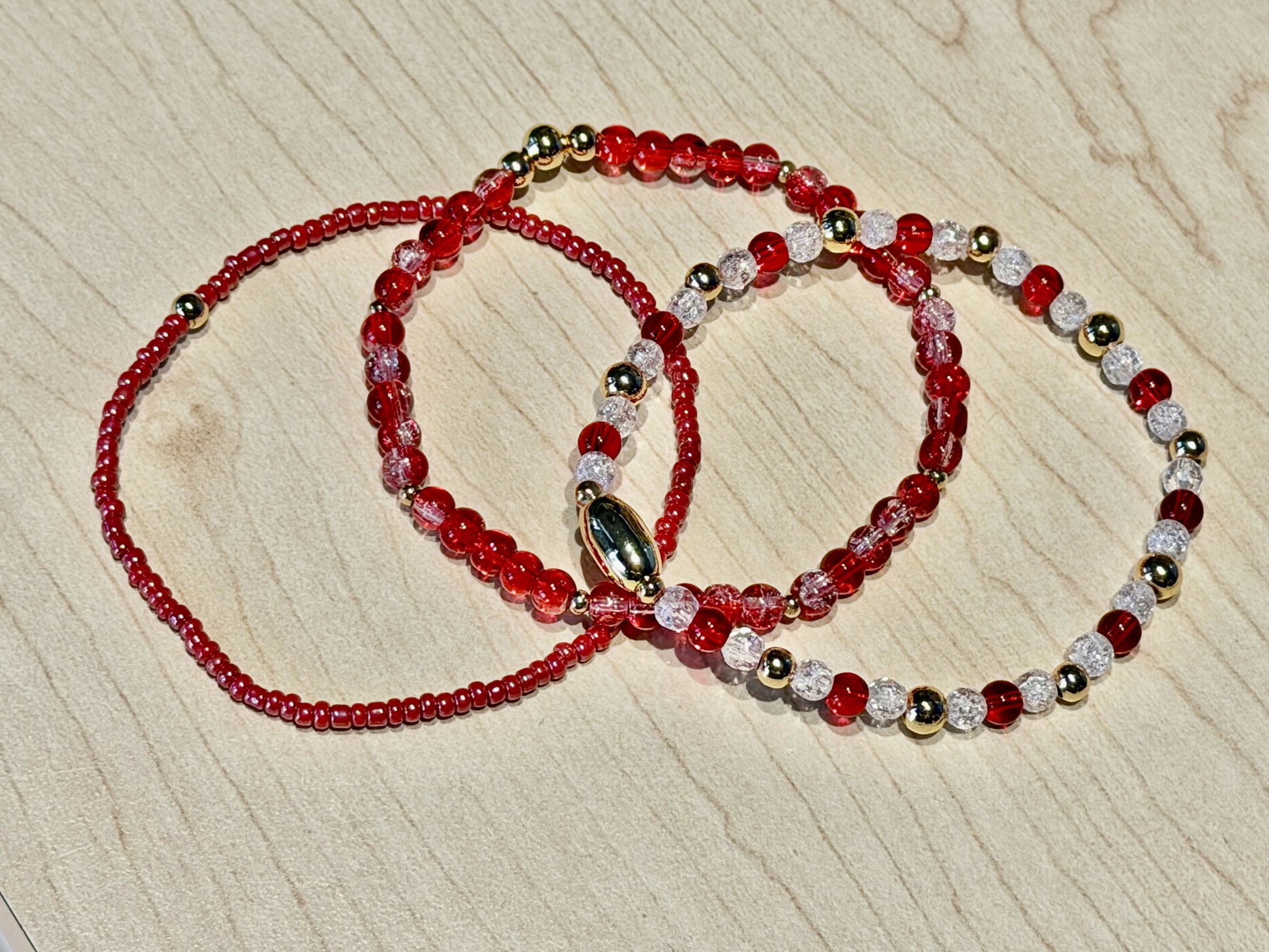 Add a touch of holiday sparkle to your wrist with this handcrafted trio. Made with high-quality glass beads, semi-precious stones, and gold-plated or sterling silver accents — never plastic or tarnishing metals — each bracelet is designed to mix, match, and shine all season long.