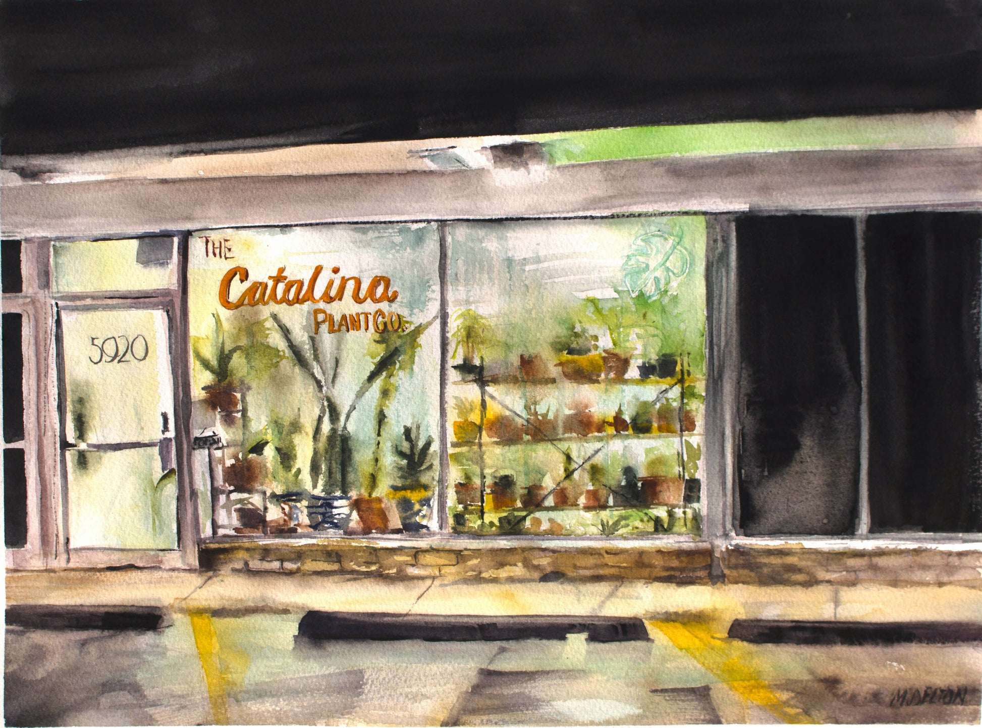 I take lots of walks in my neighborhood and I spied this lush, steamy scene on a cold, fall night. Jungle in Jefferson Park. Everything was dark except for the glow of the foliage inside.