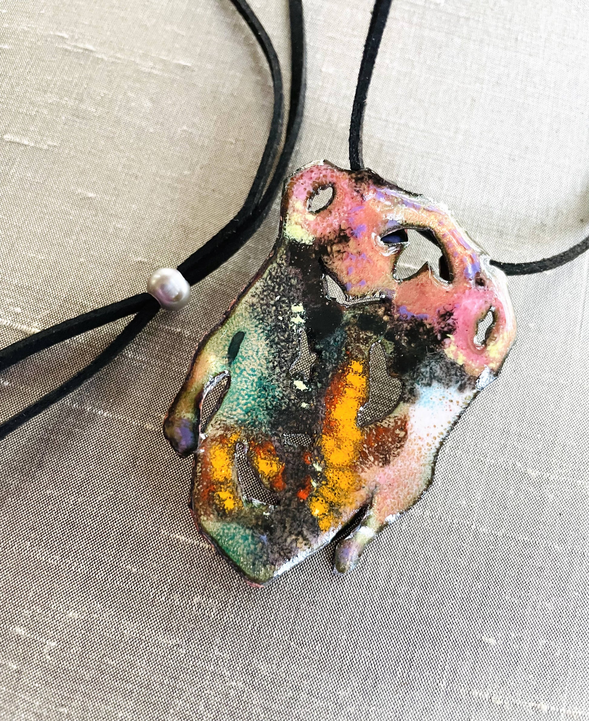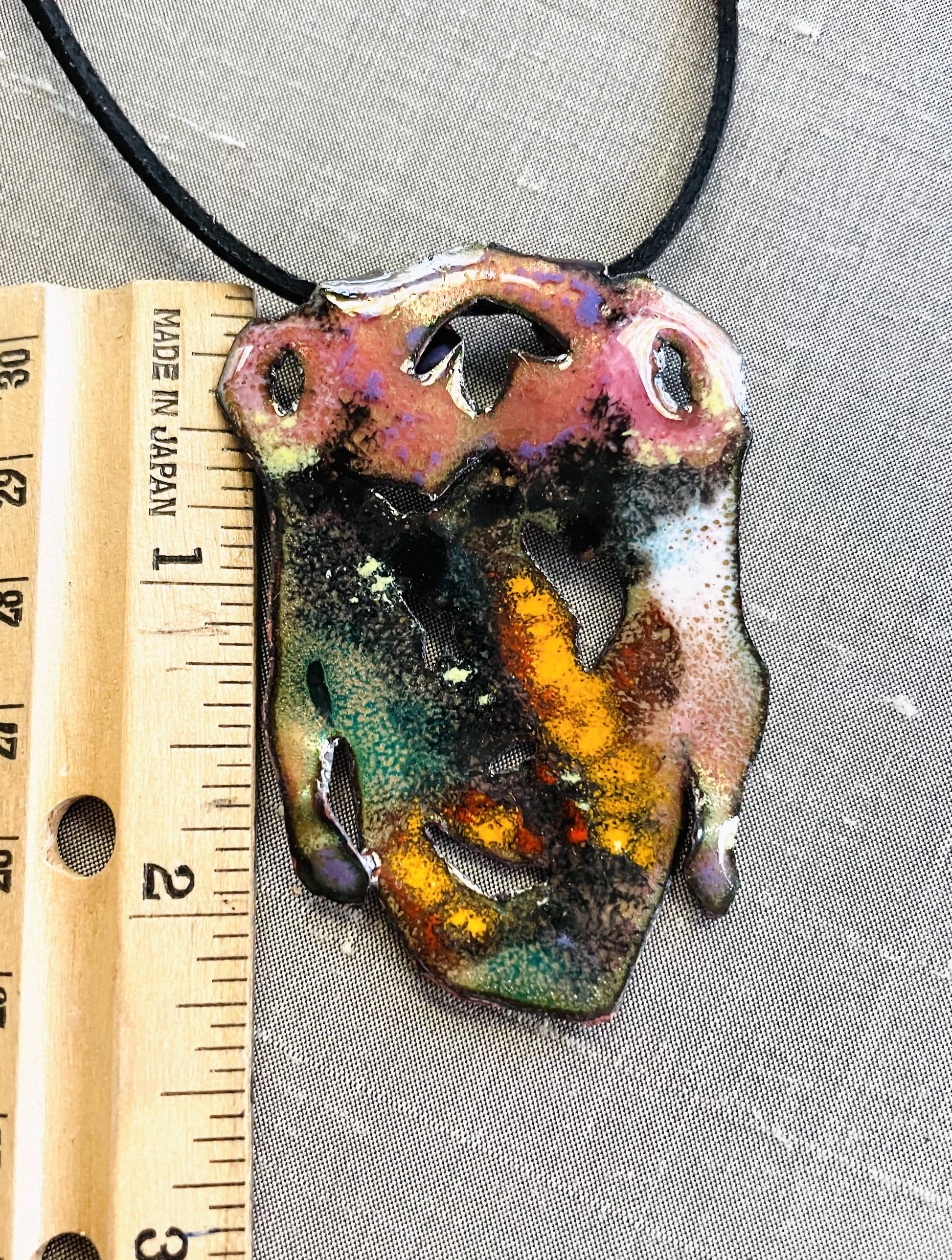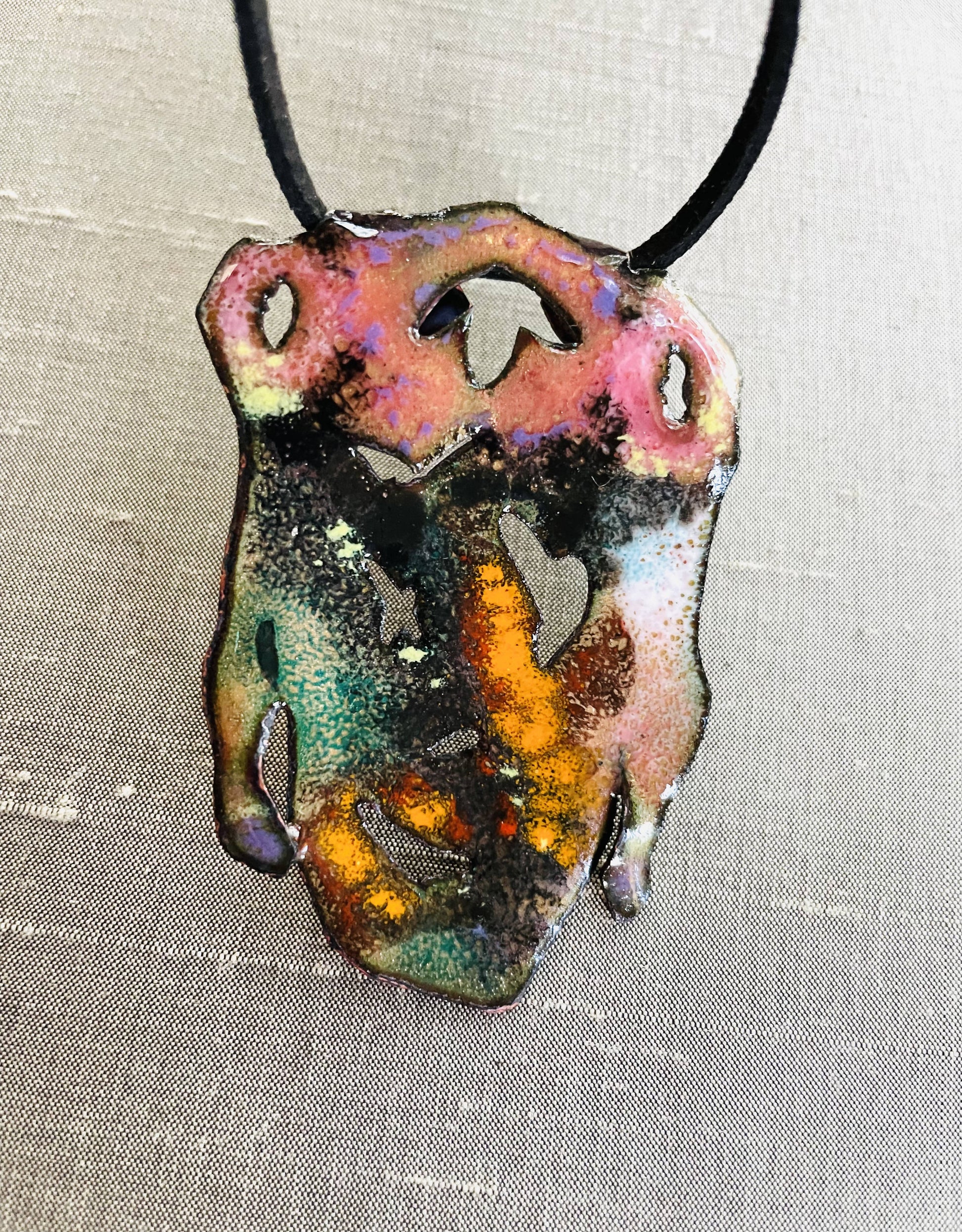 A little Catrina masterpiece statement pendant. Hand pierced, formed and enameled.