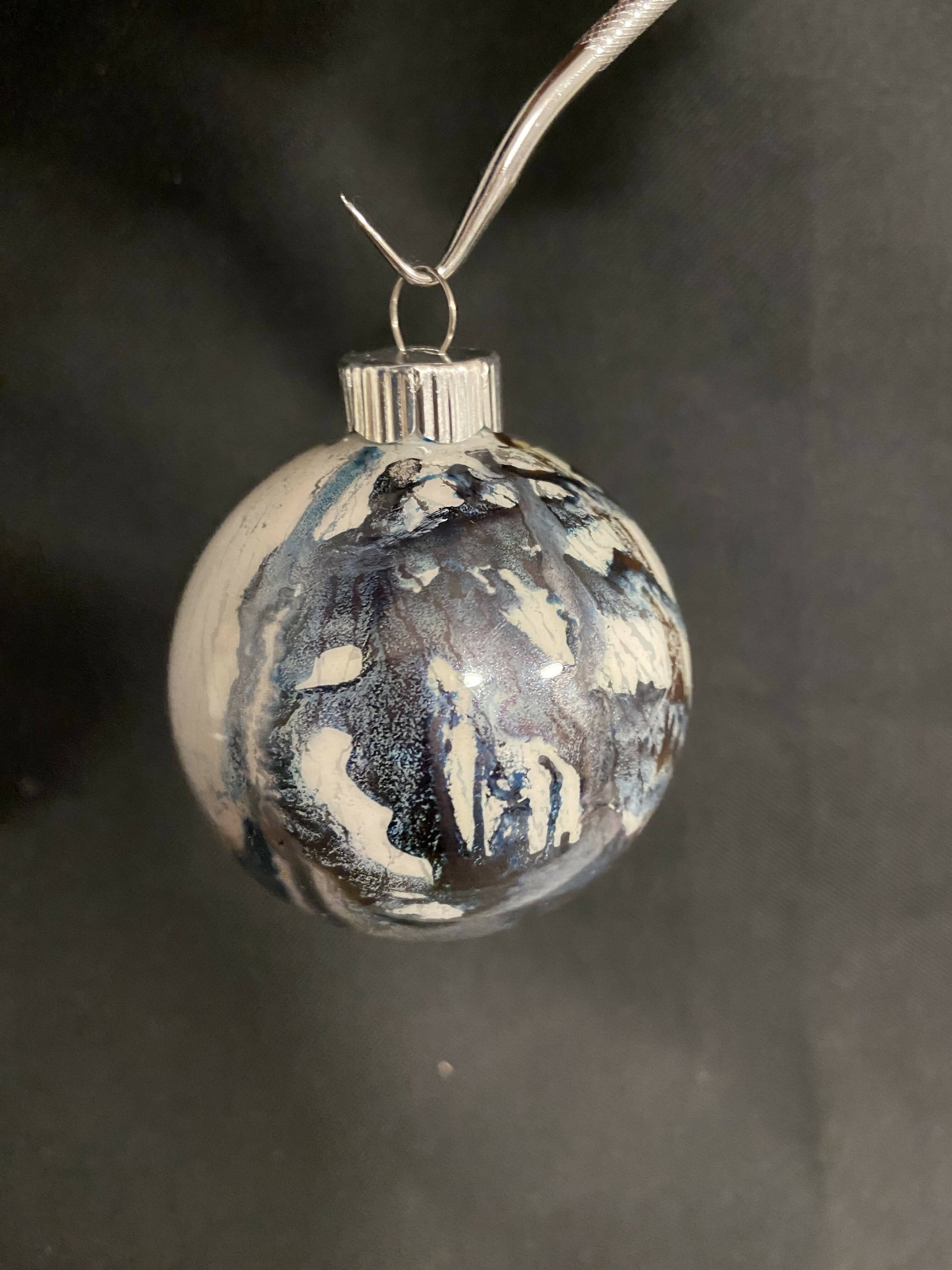 I begin with a glass round orb Christmas ornament. I paint the inside with a couple of colors to create a "moon-like" appearance, the inside is translucent when dry. Approximate 3" size diameter orb.