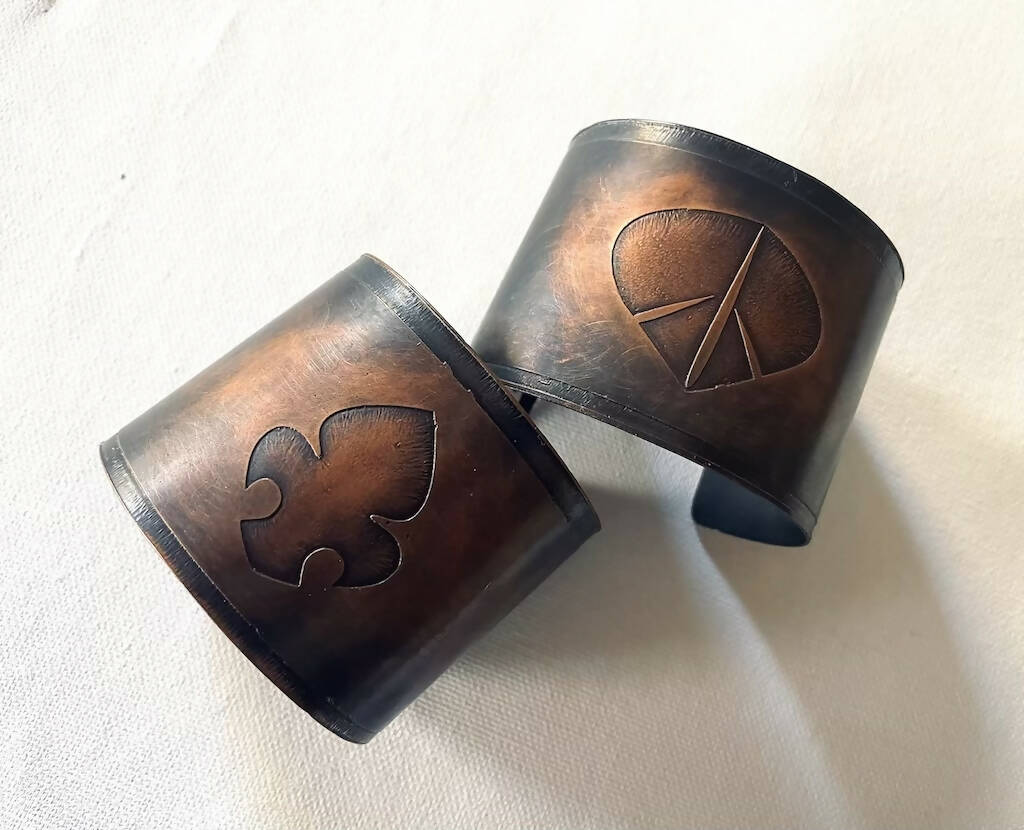Hand illustrated, etched on copper and formed onto cuffs.