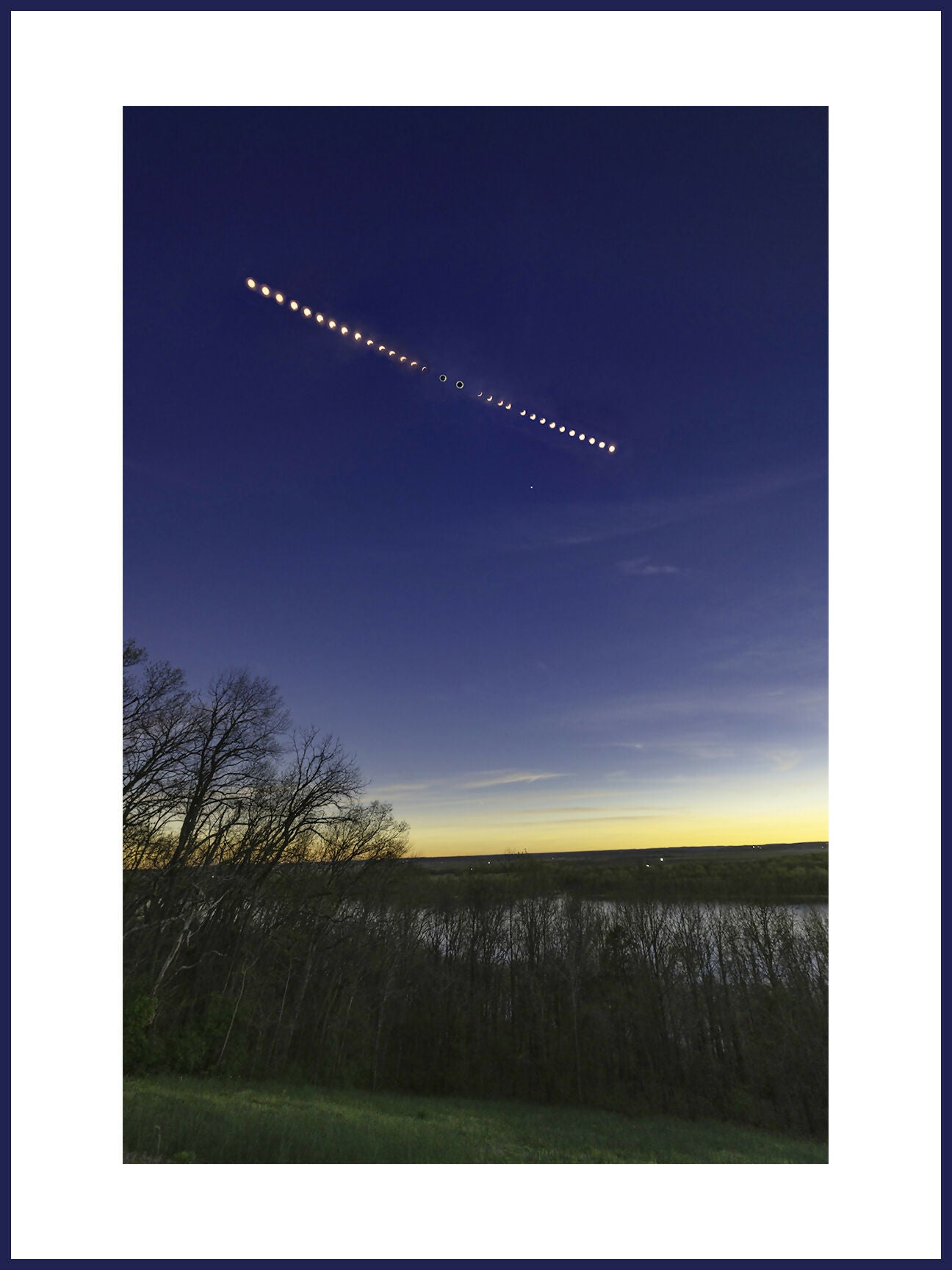 This year for the first time the Total Solar Eclipse passed over a small area of land it had in 2017's Solar Eclipse. I stood within feet of where I stood in 2017 in 2024 and shot these images. The time-lapse of the entire eclipse. It is available framed or unframed in many sizes.