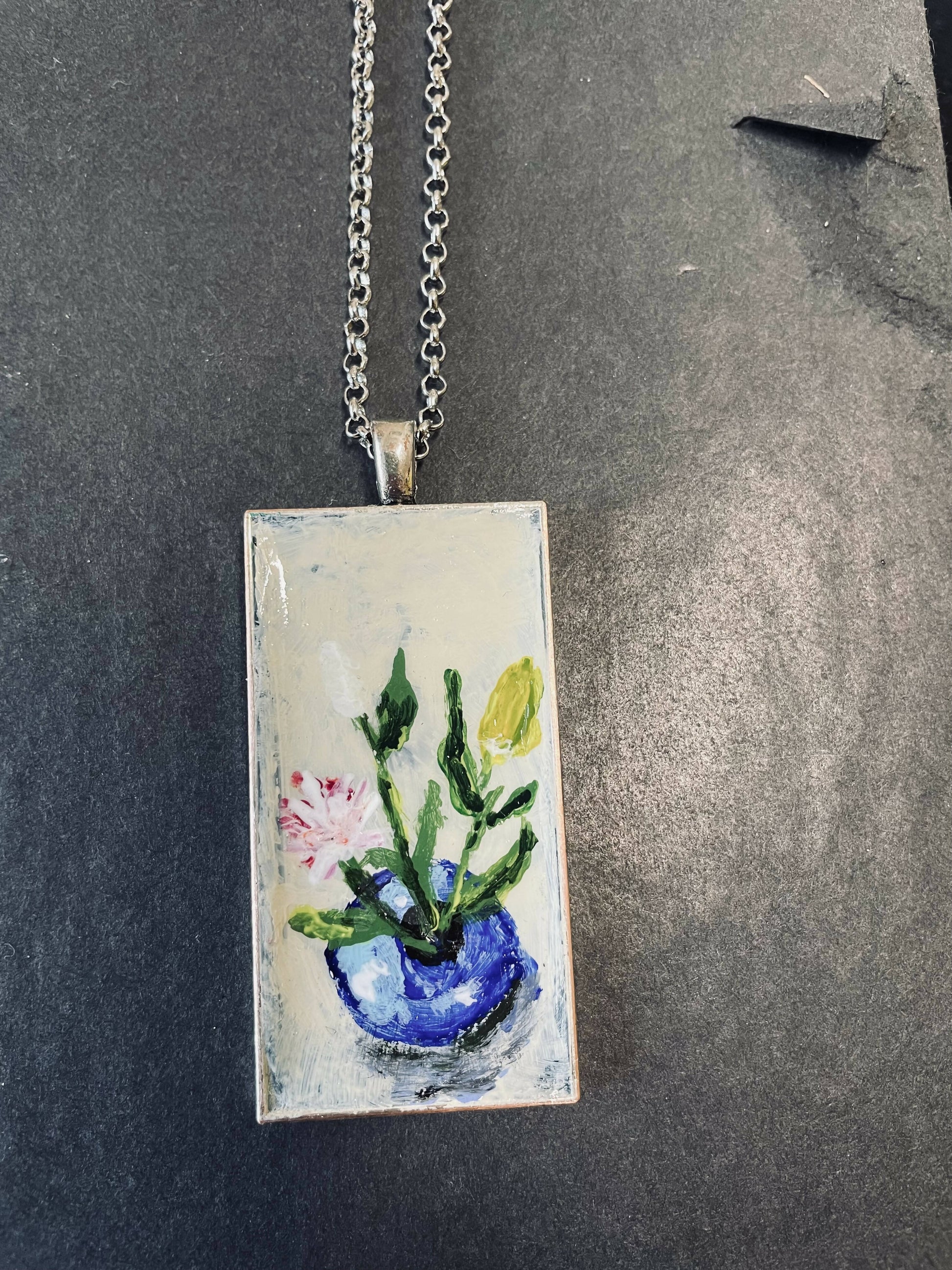 Rectangular, silver pendant with cream background, blue vase, yellow flower, pink flower