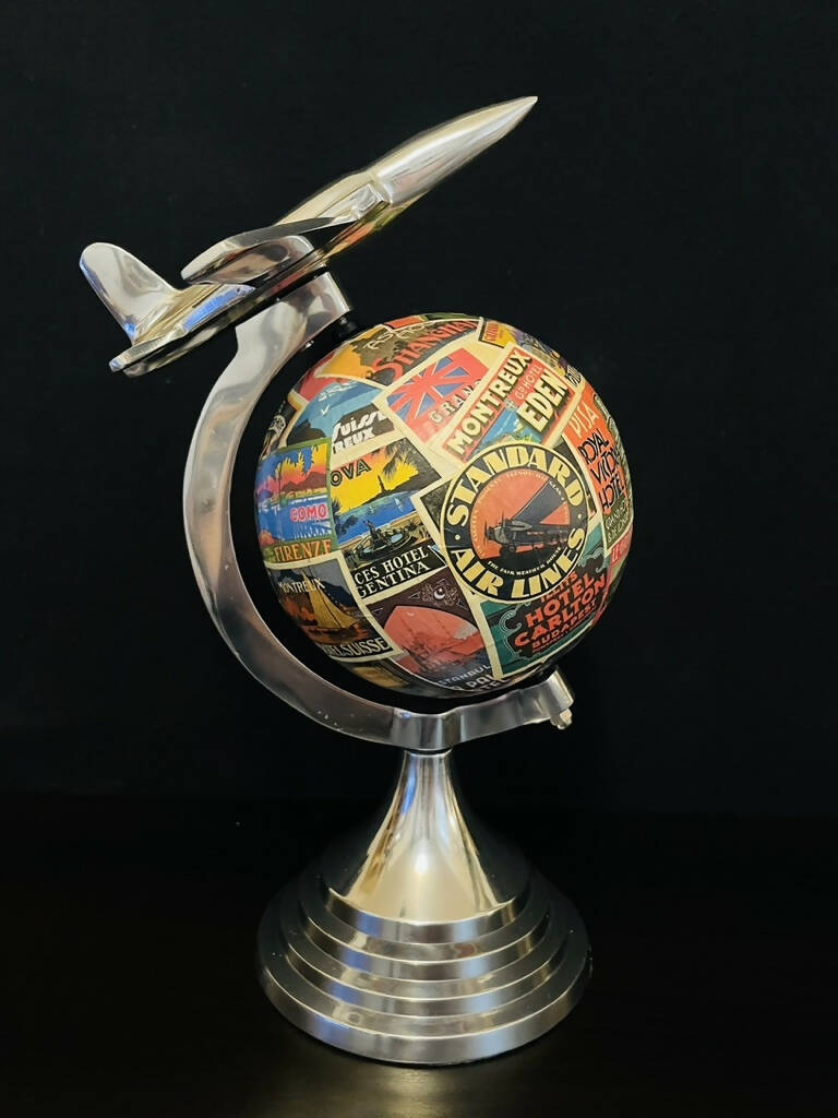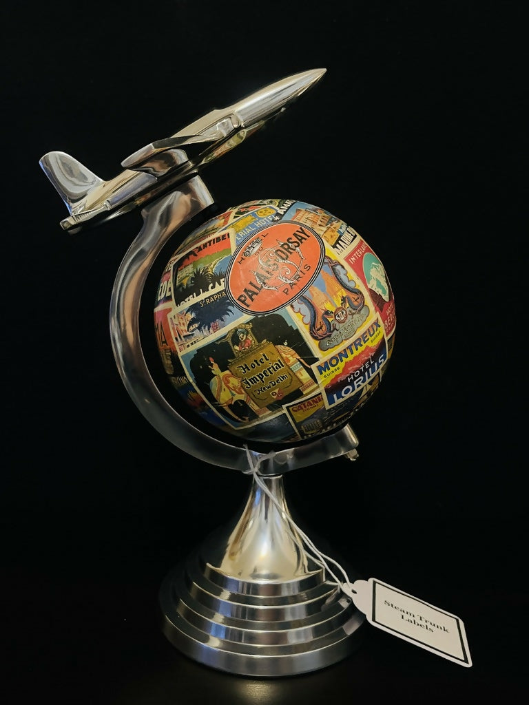 Iconic deco plane globe wrapped in steamer trunk labels from around the world. This piece celebrates the mystique of travel from days gone by.