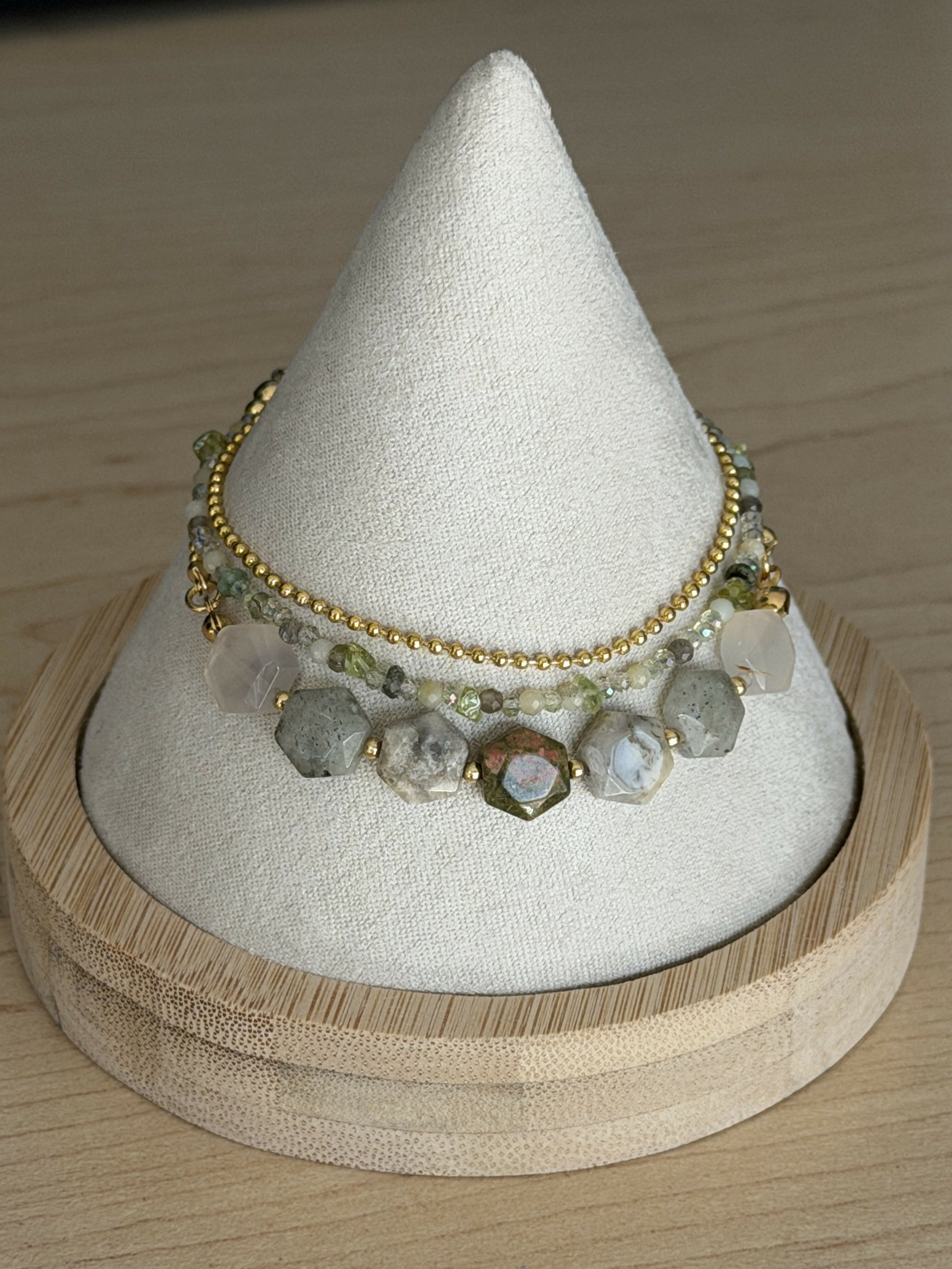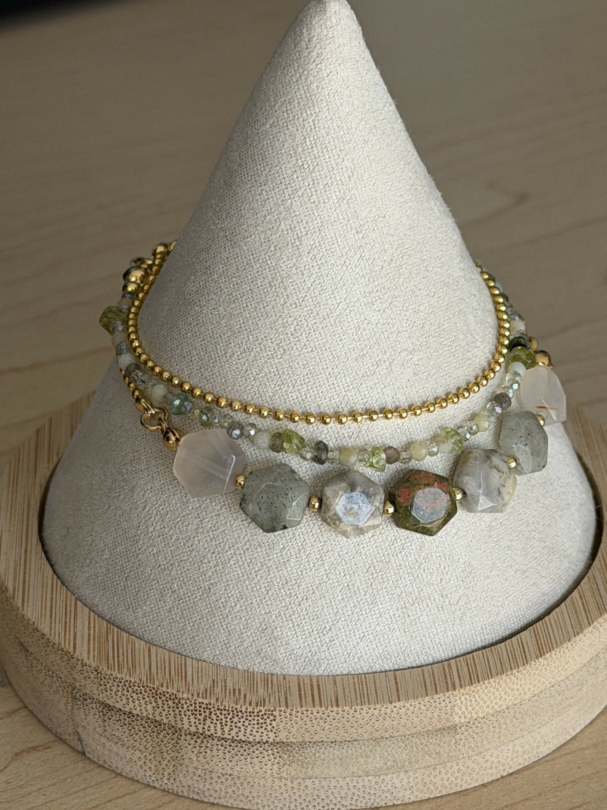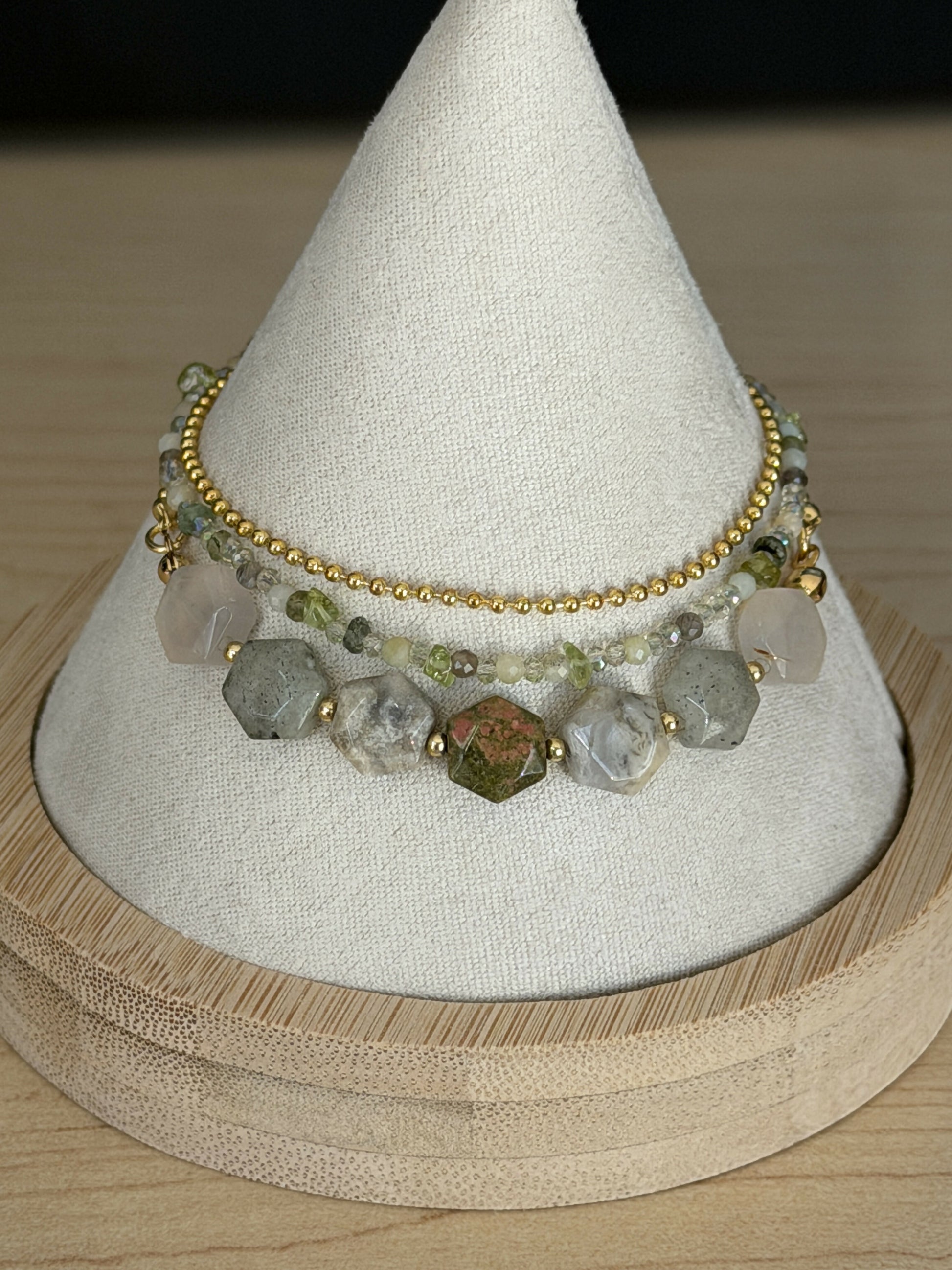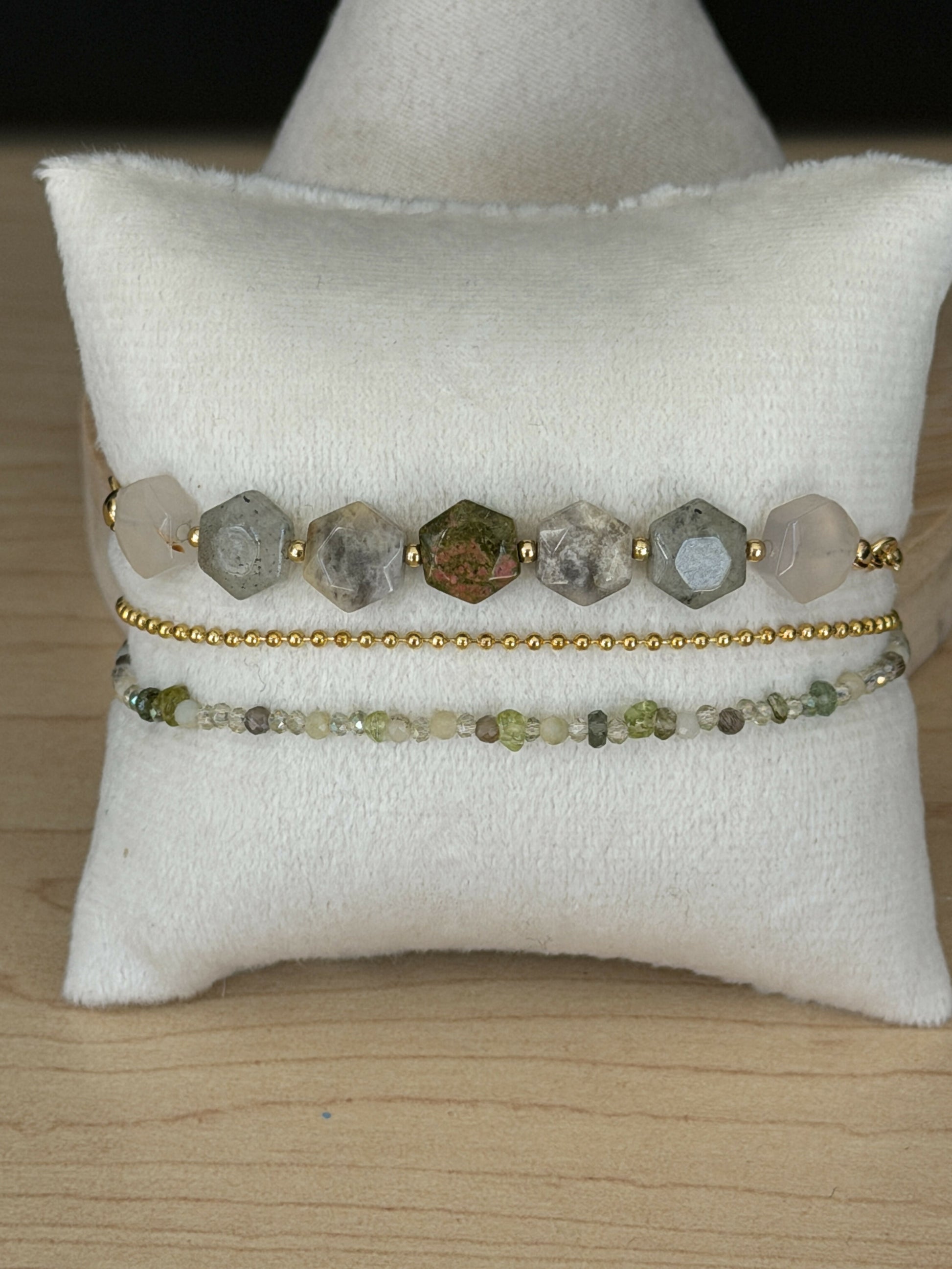 Add a touch of elegance to your wrist with this handcrafted Triplet. Made with high-quality glass beads, semi-precious stones, and gold-plated or sterling silver accents — never plastic or tarnishing metals — each bracelet is a one of a kind design.