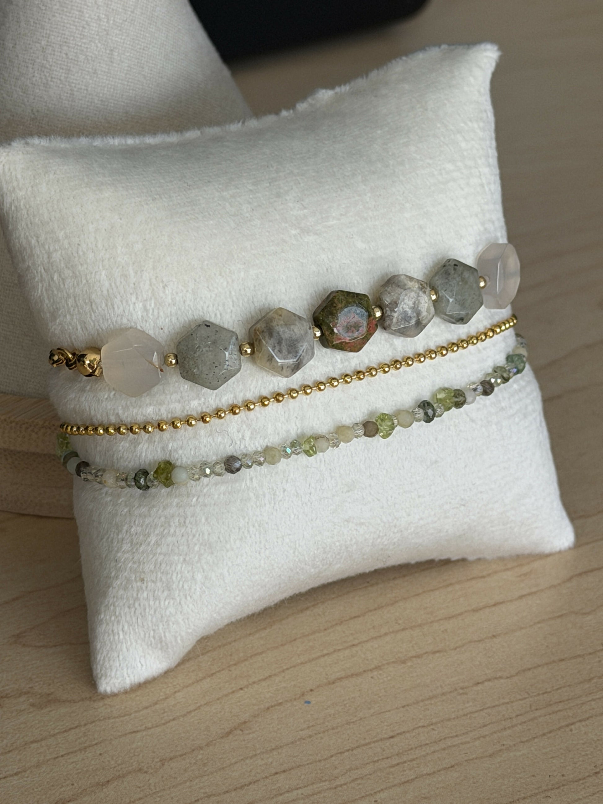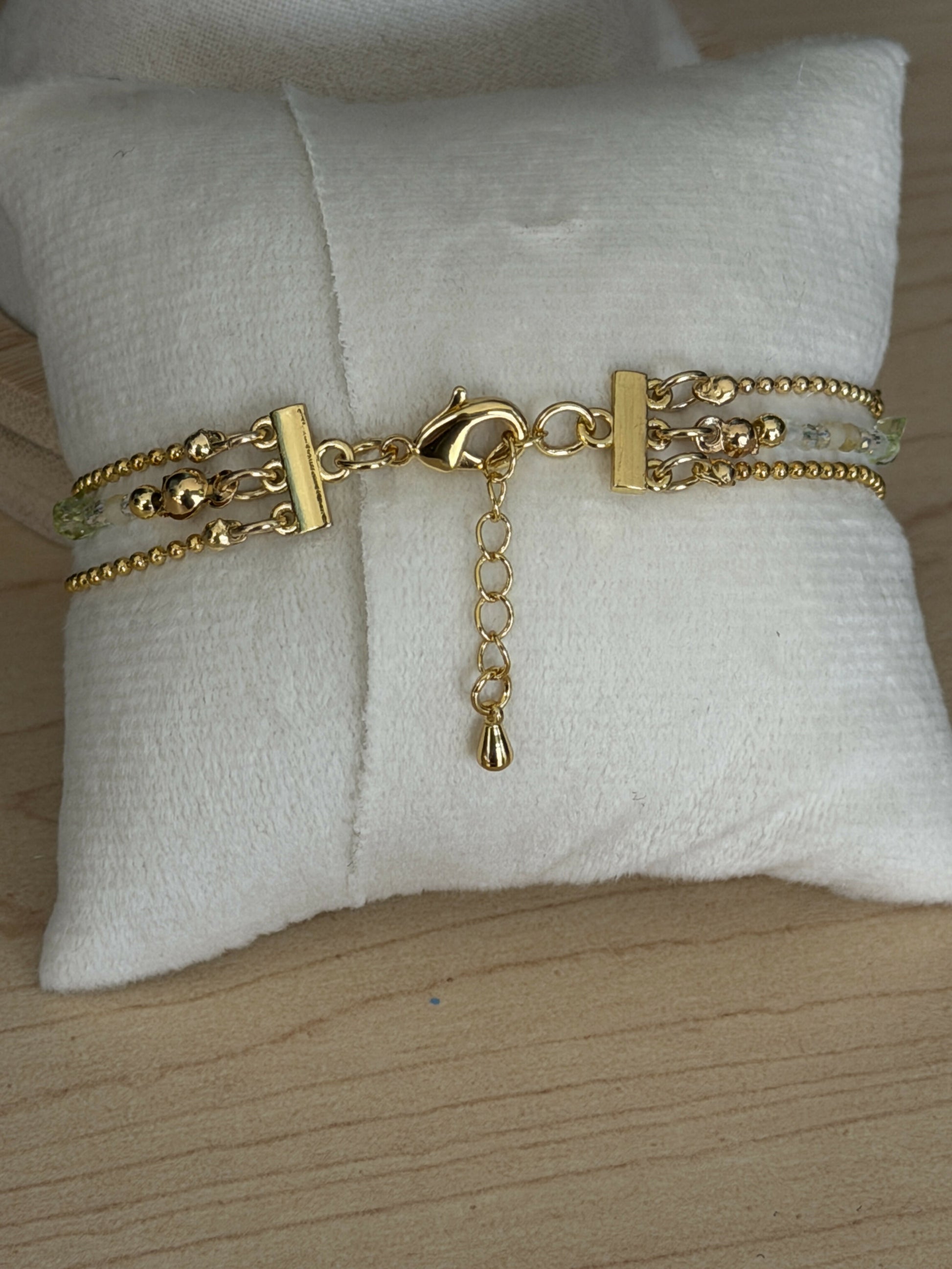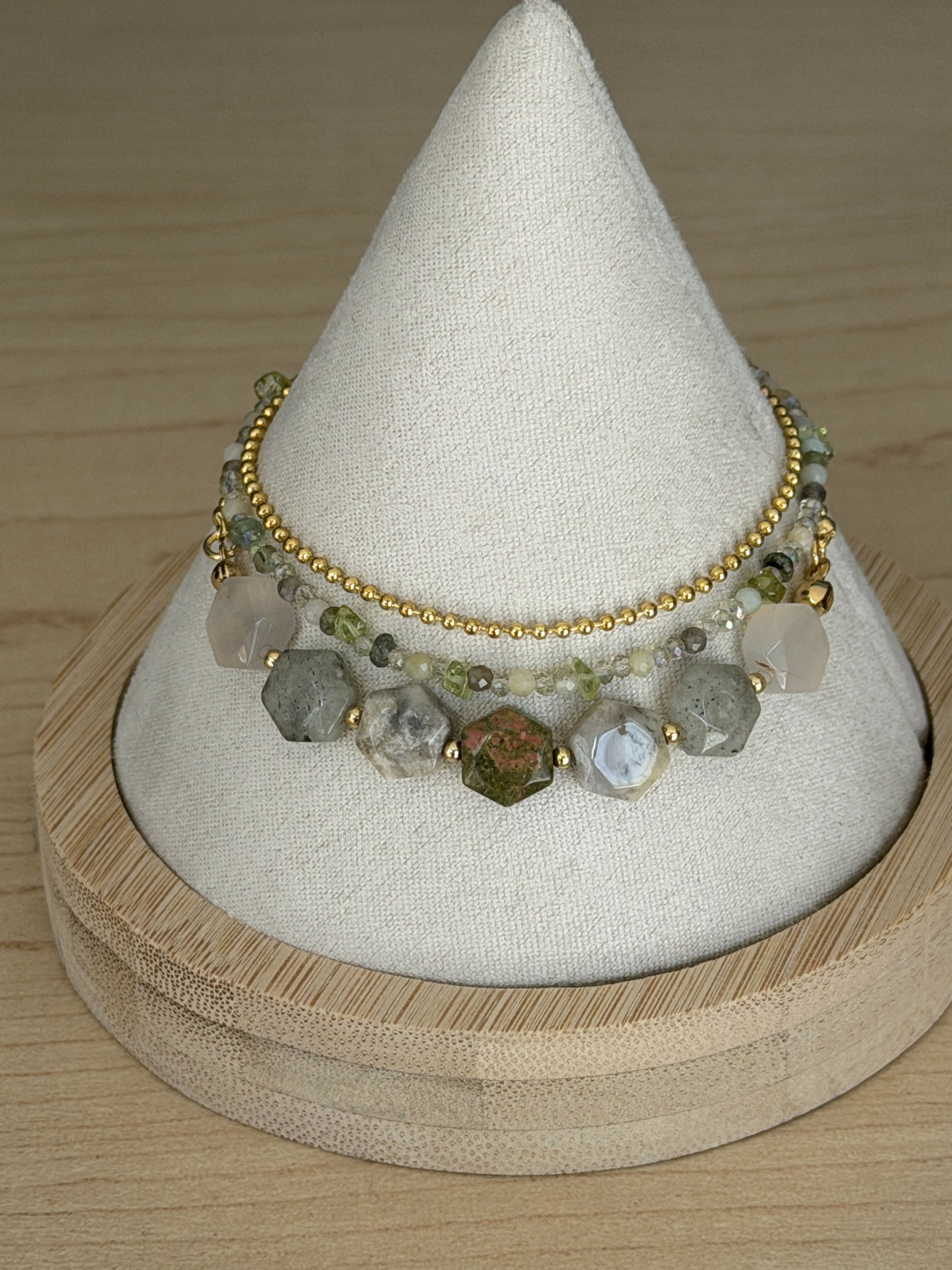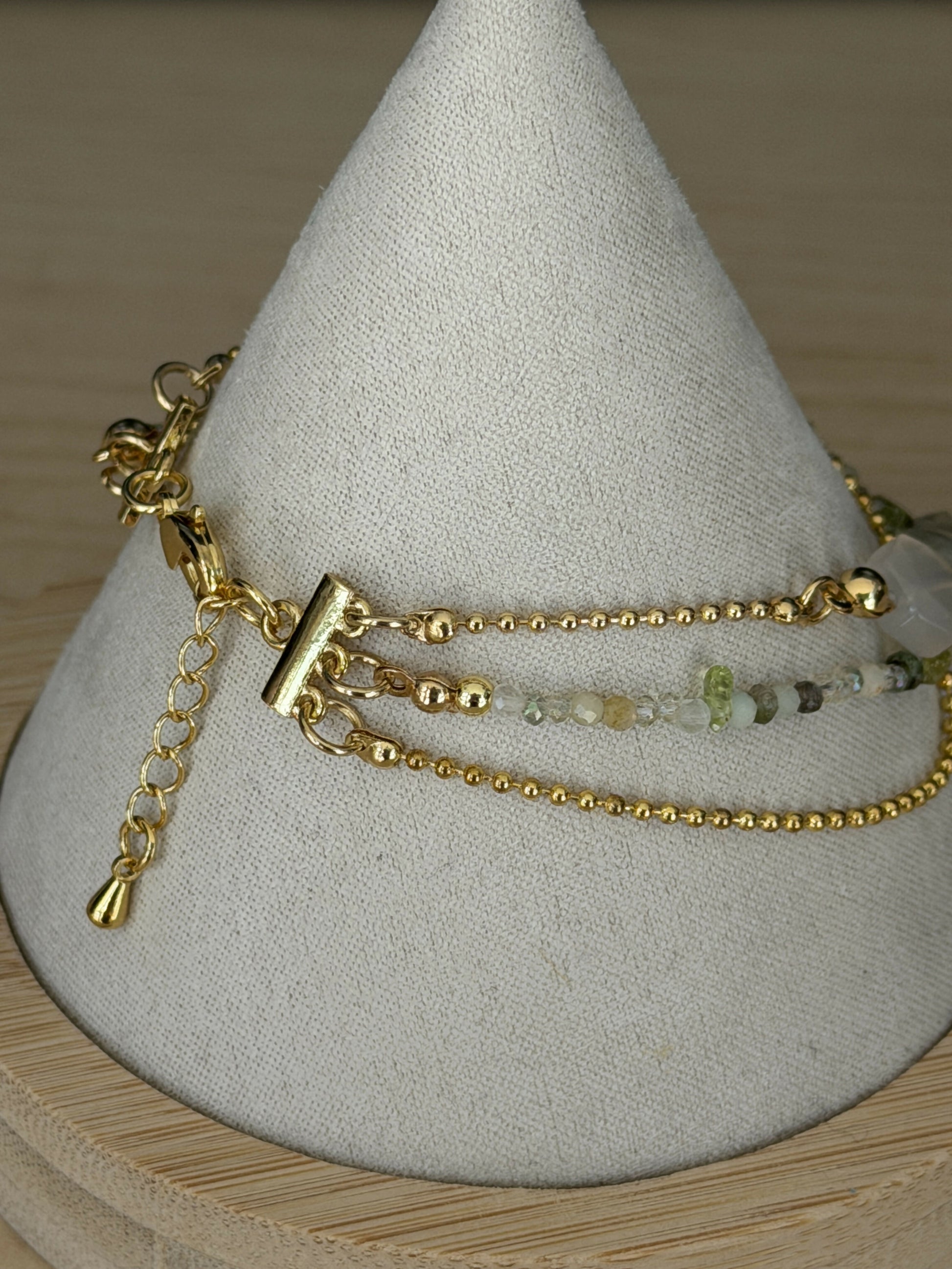 Add a touch of elegance to your wrist with this handcrafted Triplet. Made with high-quality glass beads, semi-precious stones, and gold-plated or sterling silver accents — never plastic or tarnishing metals — each bracelet is a one of a kind design.