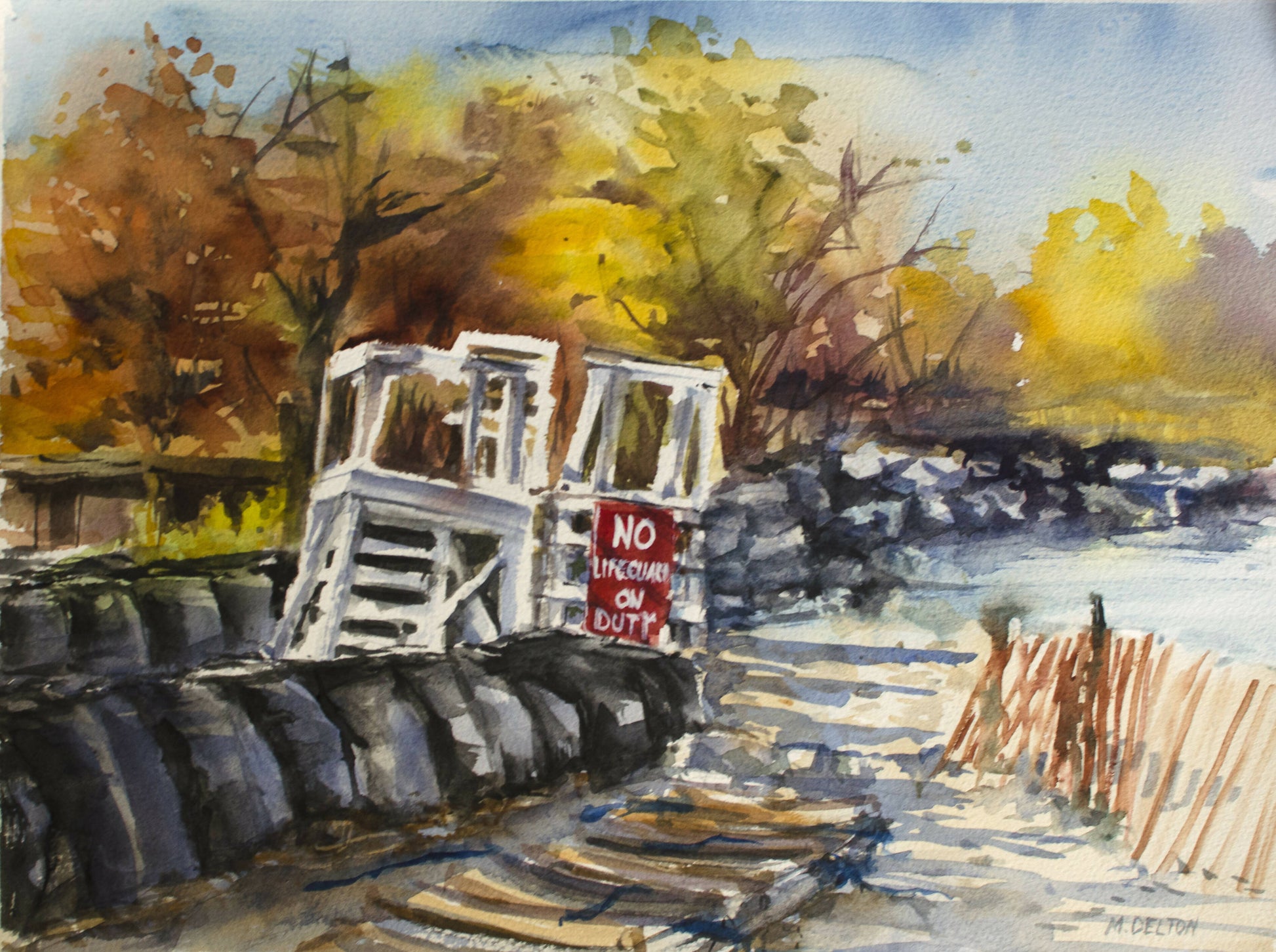 Painted plein air after a day of kayaking, I was drawn to the bright whites of the crooked lifeguard towers against the colorful leaves of the park. The setting sun made for some beautiful shadows.