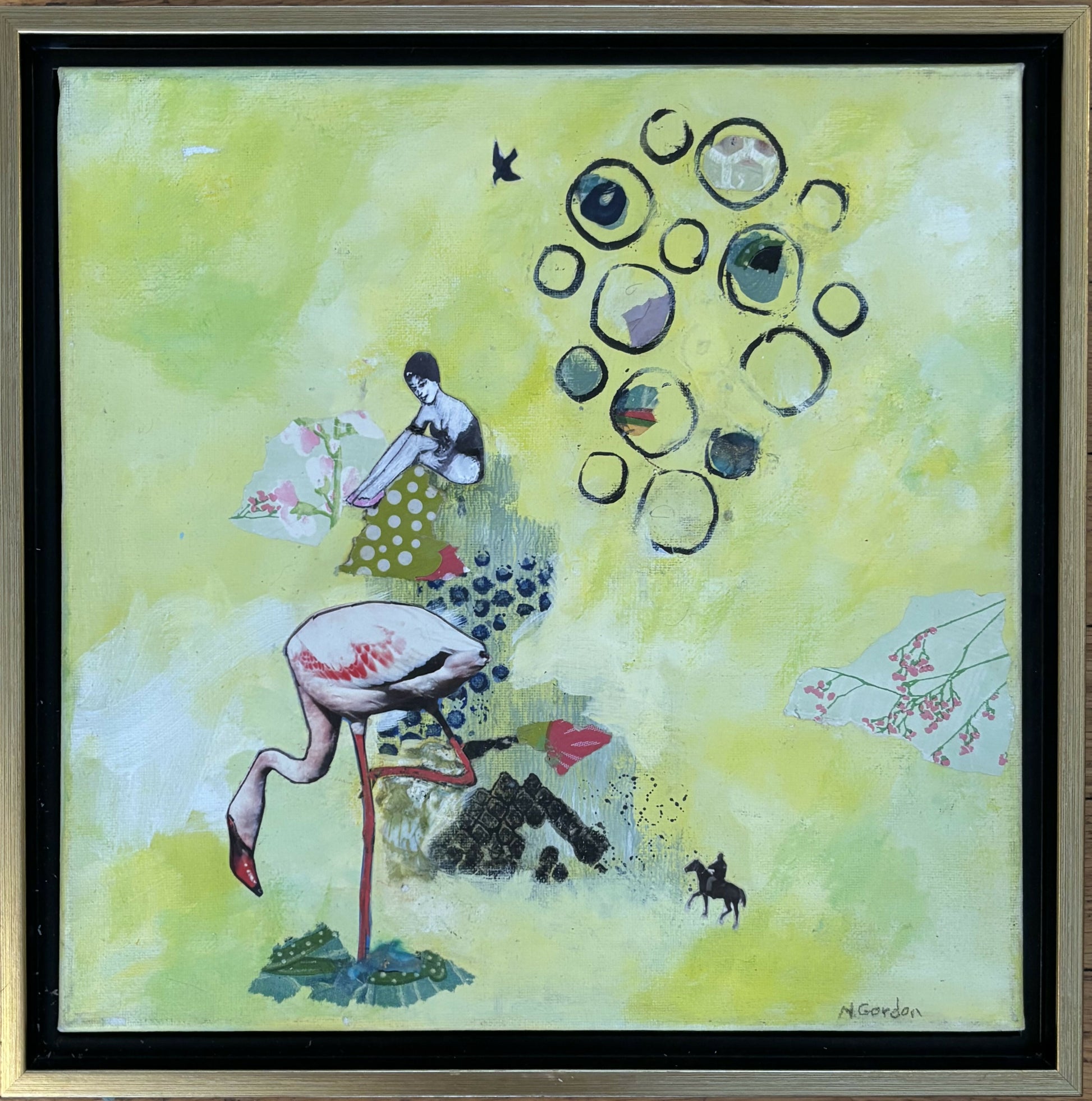 12x12” mixed media collage made of paint, paper & photos. All handcut and pasted by me. Canvas in a float frame ready to hang.