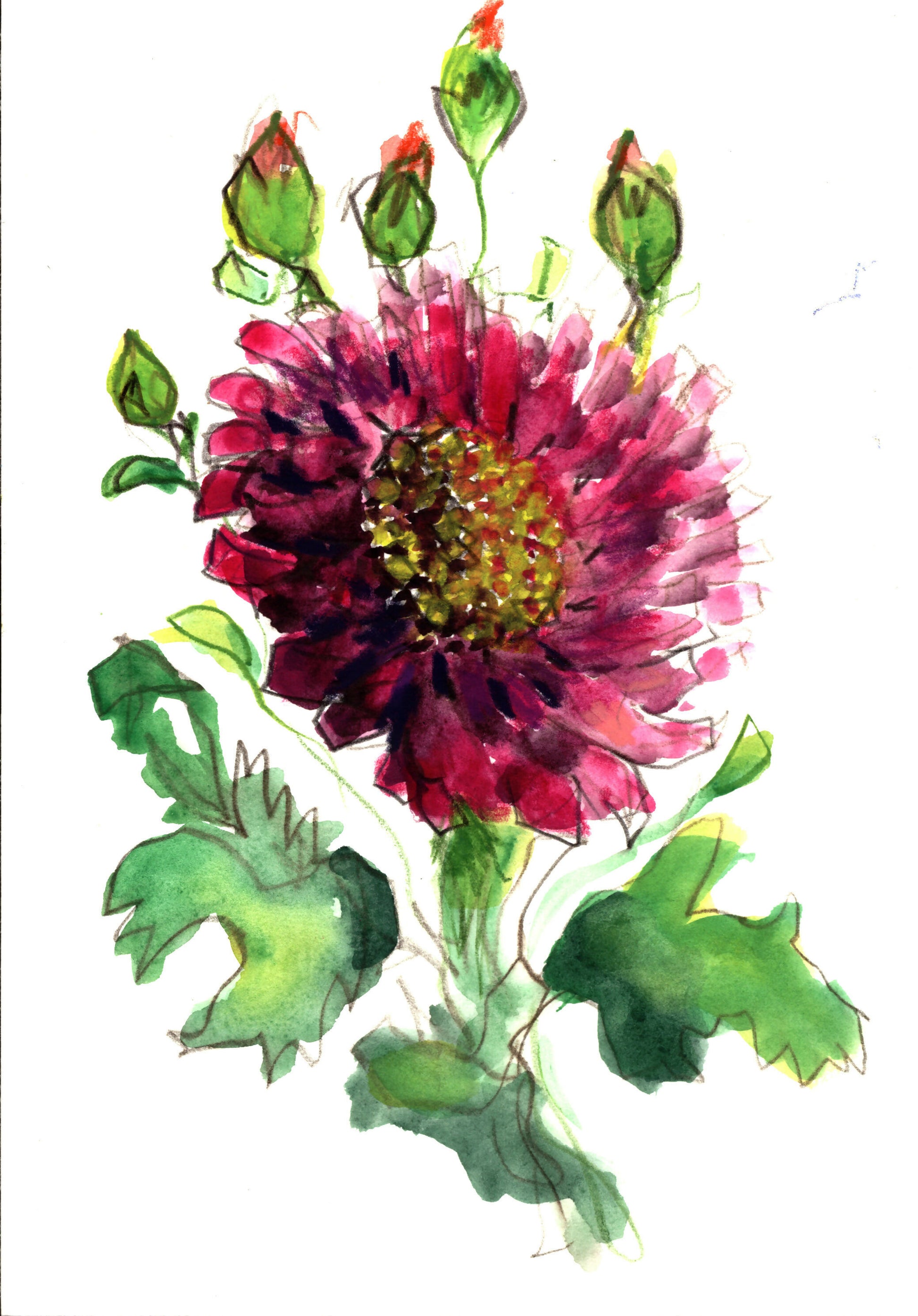 This is an original mixed media floral made with expressive mark-making and soft washes. It shows one large blooming red flower surrounded by smaller flower buds, expressing the poetry of nature.