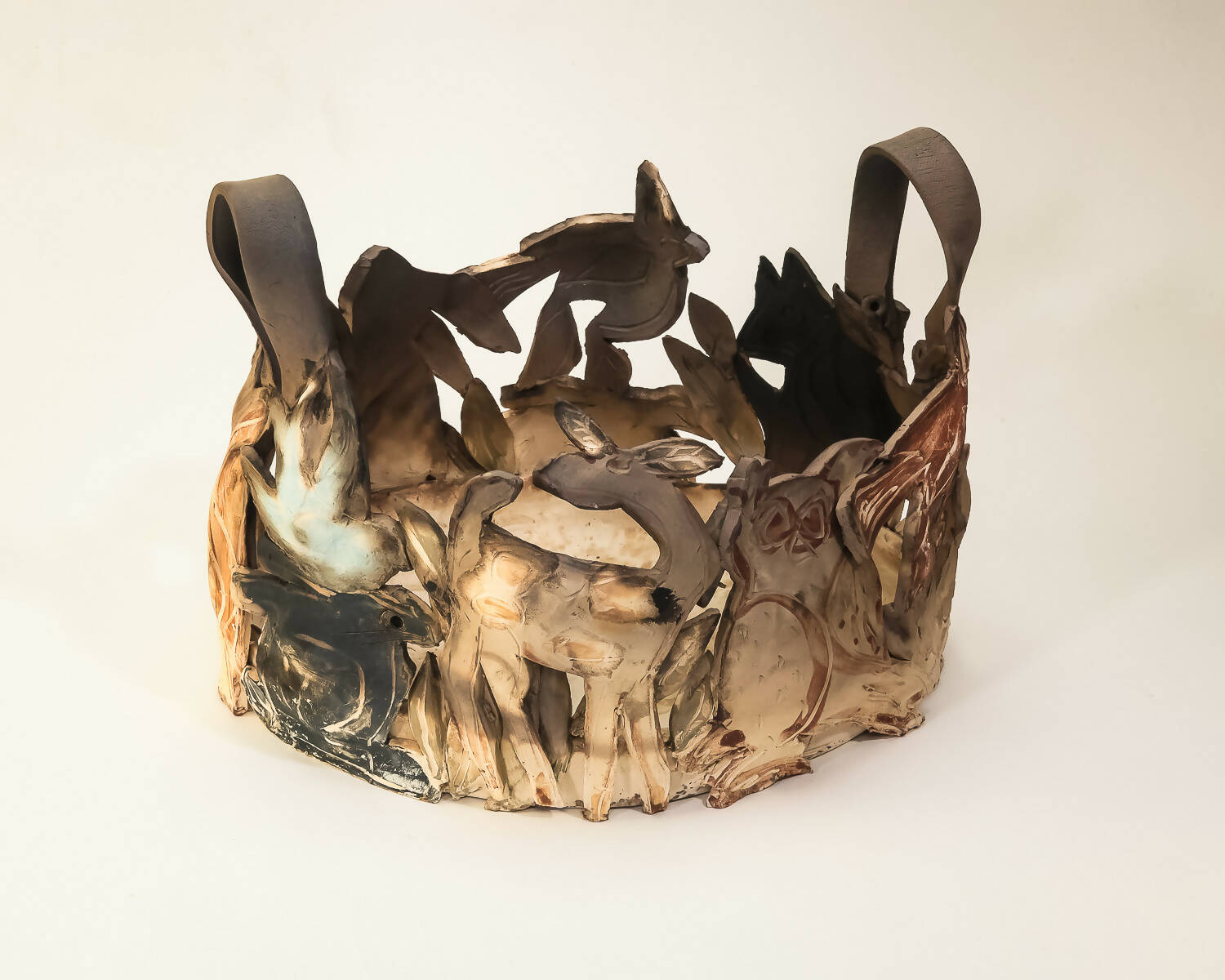 Ceramic basket with woodland animals fired in the magical process of a pit fired process.