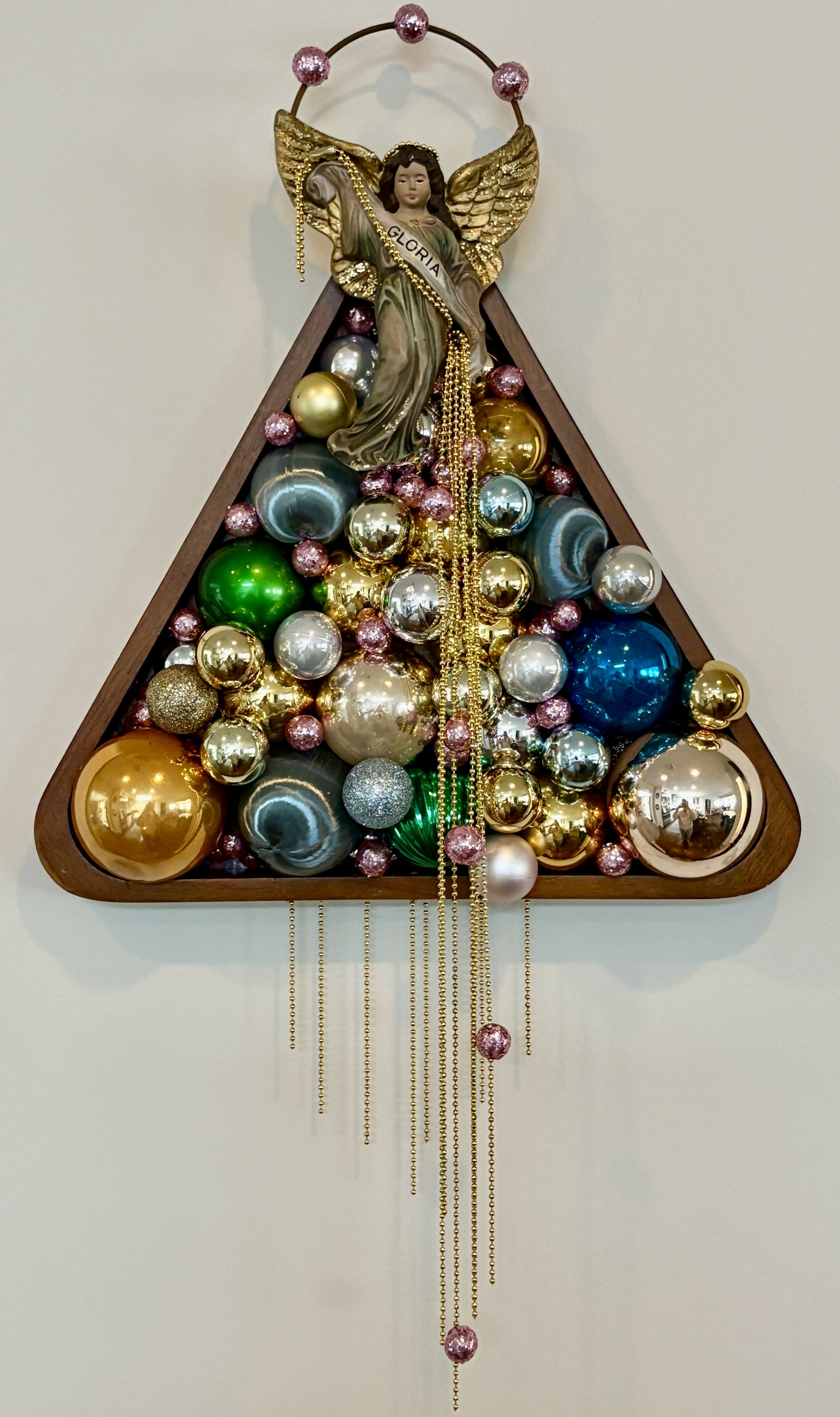 This enchanting upcycled piece of art is wild, glittery, fantastic and fun! I created her using all upcycled materials, this spruced up angel Gloria floats above her collection of gloriously shiny ornaments interspersed with glittery pink balls which tumble down from her arms upon golden strands of beads. Her crown is magical. Framed in a beautiful deep brown hardwood triangle. She is one of a kind Christmas glitterati! 22” x 13”