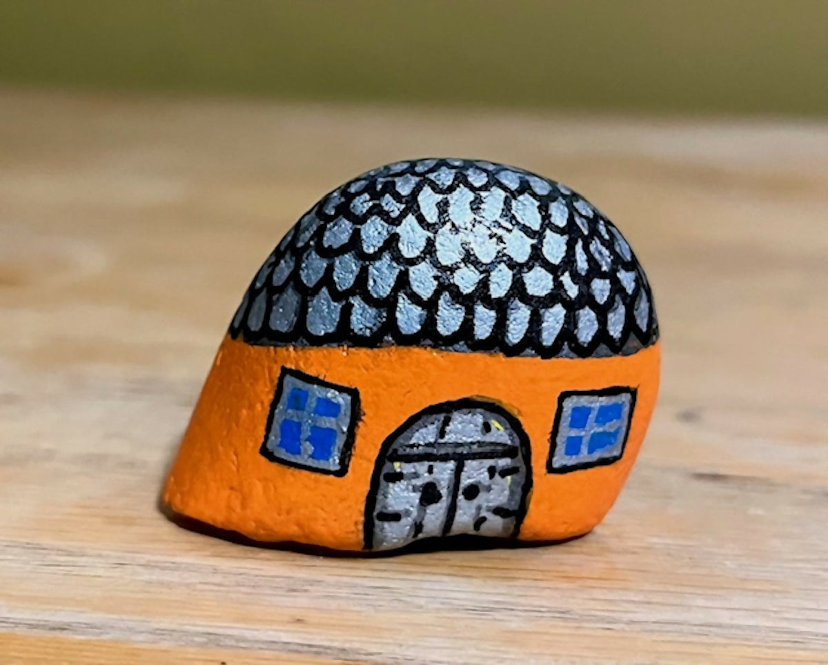 Small rock home. Beach rock painted with acrylic and sealed. Aprox 1 x 1/2 in.