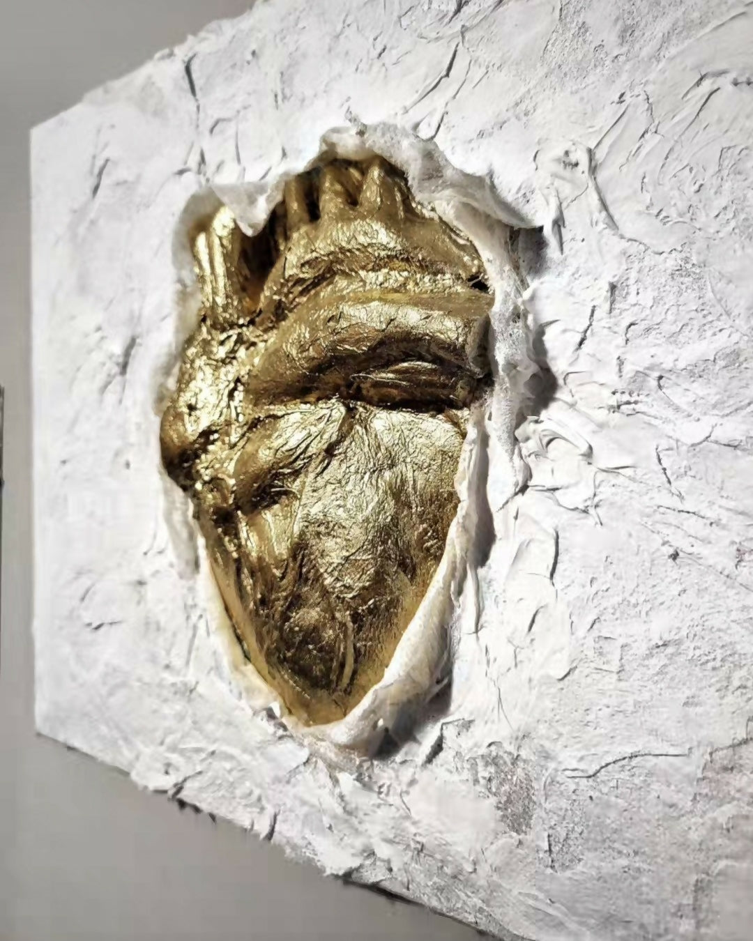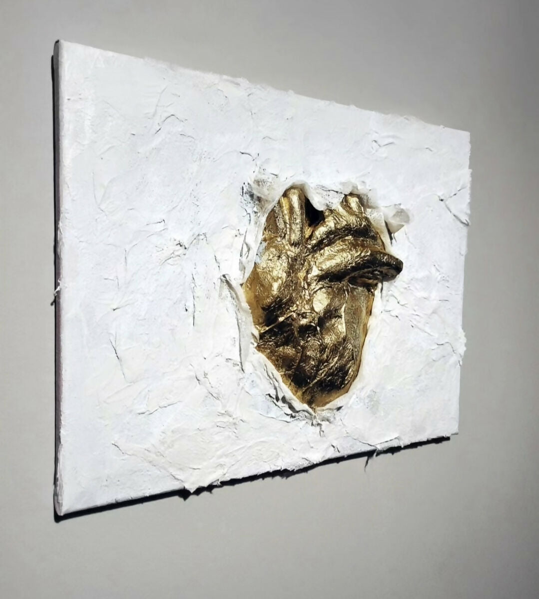 A golden anatomical heart made of clay rests at the center, wrapped in textured bandages. Mixed media contrasts fragility and strength, rawness and preciousness.