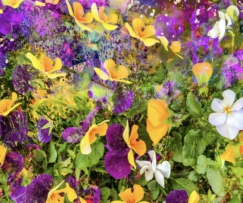 This is a digital collage of pansies in a garden, sized 24" x 20".