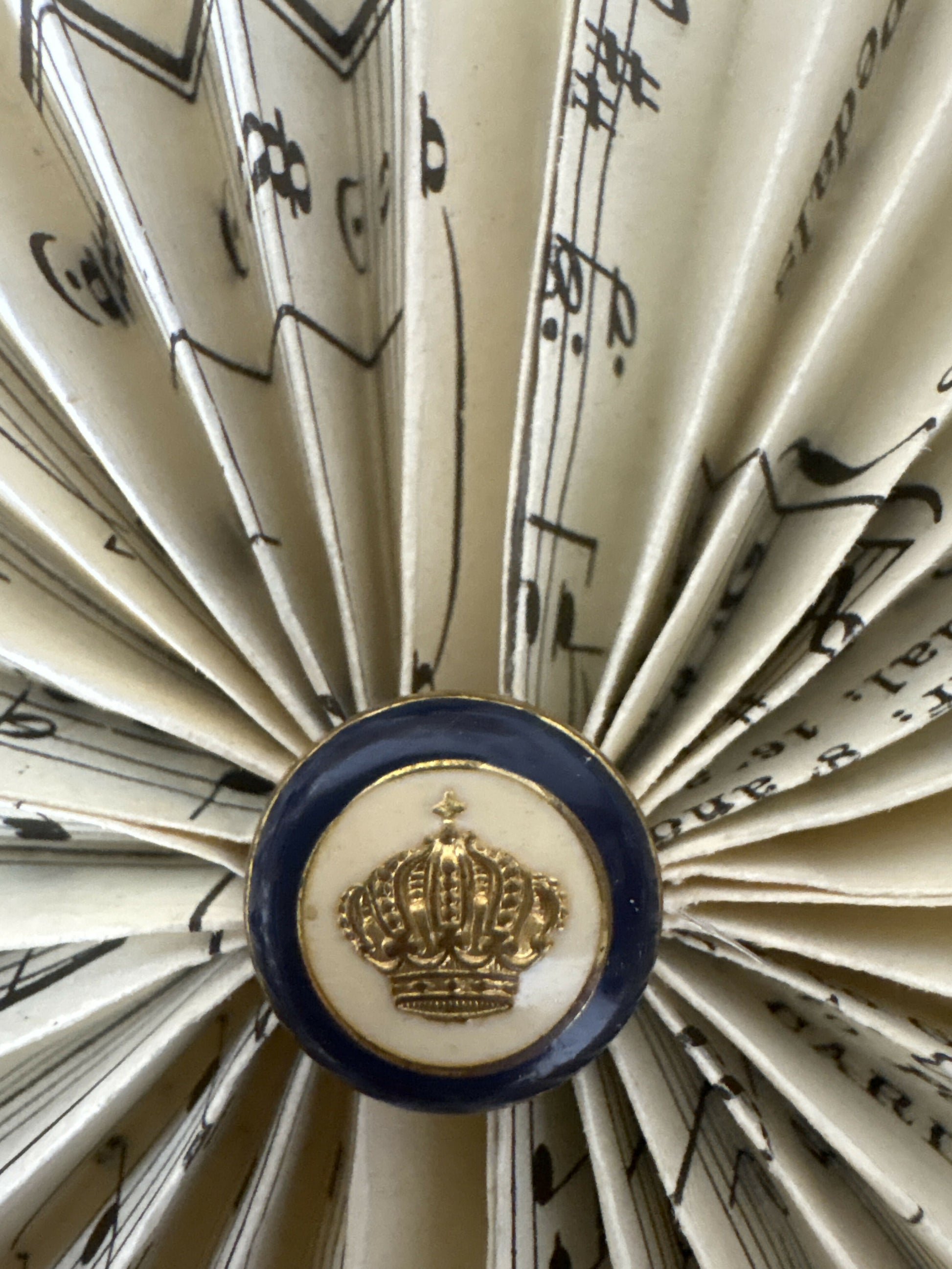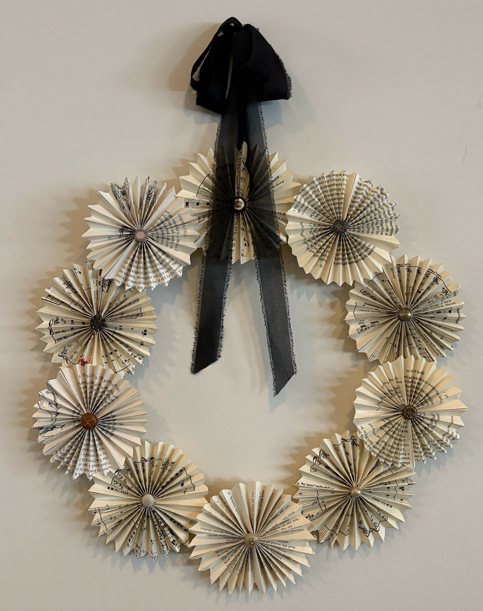 Designed using an elegant mix of book pages, vintage sheet music and a beautiful collection of complimentary buttons, including a royal crown as her keystone. Her Highness is 16” x 16”. She was made using upcycled recycled materials !