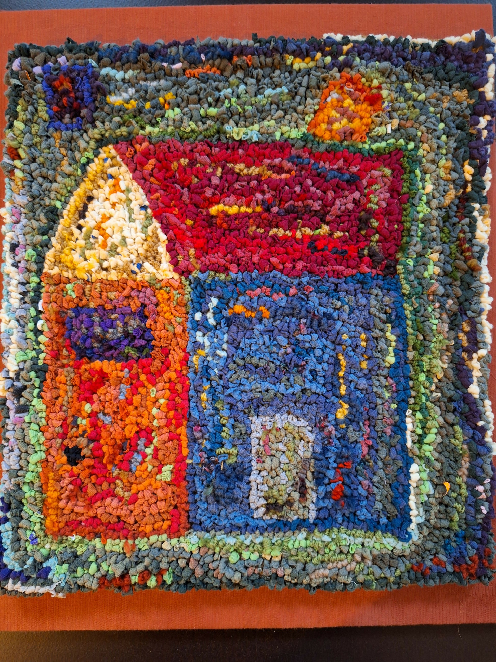 Hooked fabric piece on wood, ready to hang, 13 x 16 in