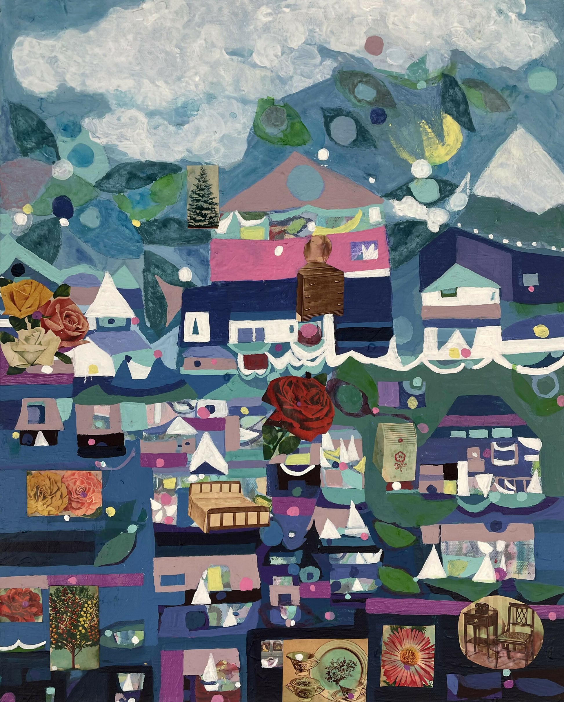Acrylic, watercolor pencil and recycled vintage paper on canvas