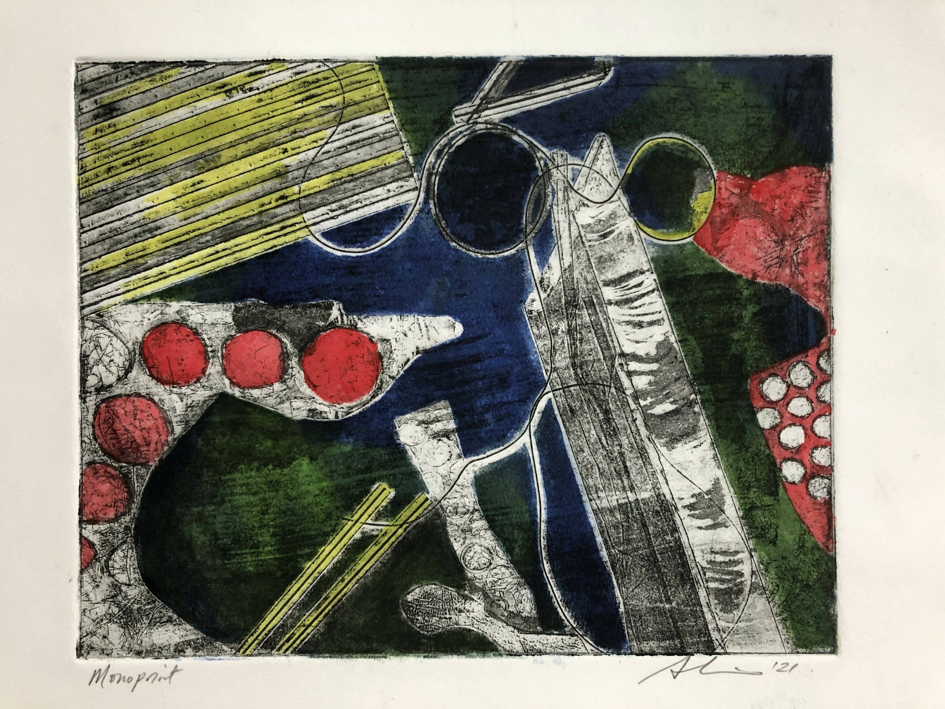 This is a one of a kind original etching hand colored mono print. It was made on a zinc plate and run through a press. It is 10"x8" on paper.
