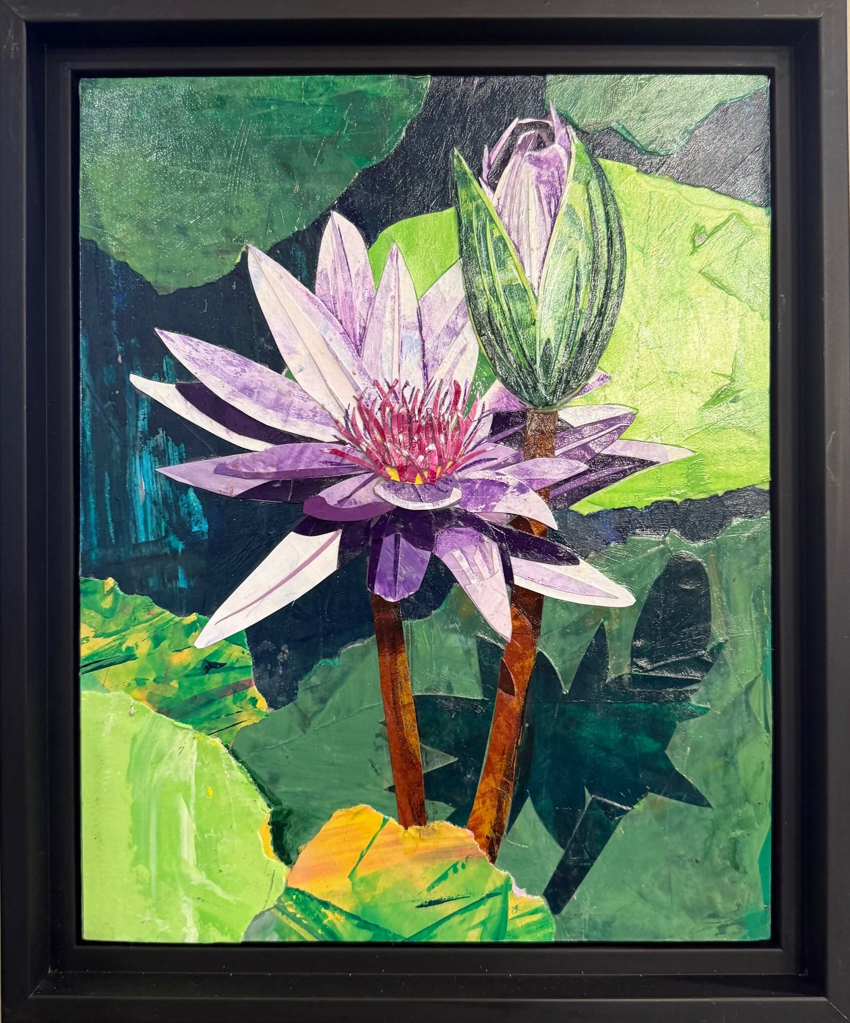 Framed in a black float frame, wired and ready to hang.
