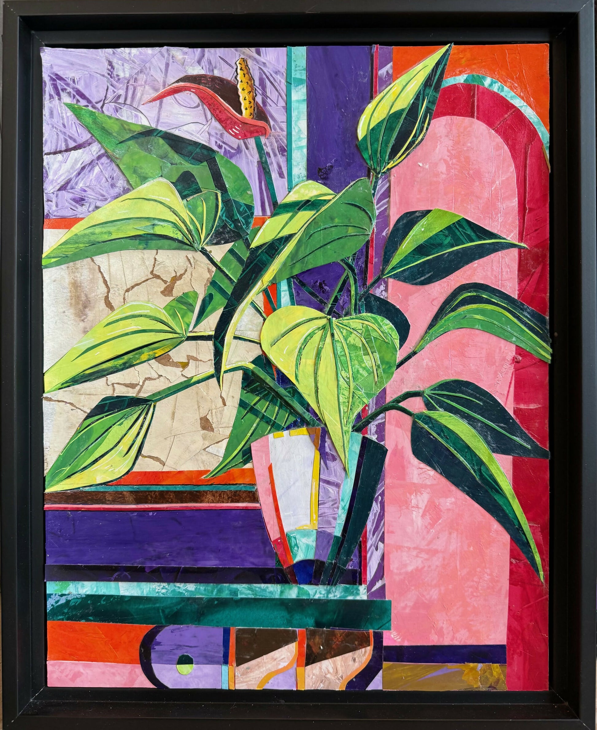 Mixed Media collage using hand painted cut and ripped paper on cradled wood panel. Framed, wired, and ready to hang in a black float frame.