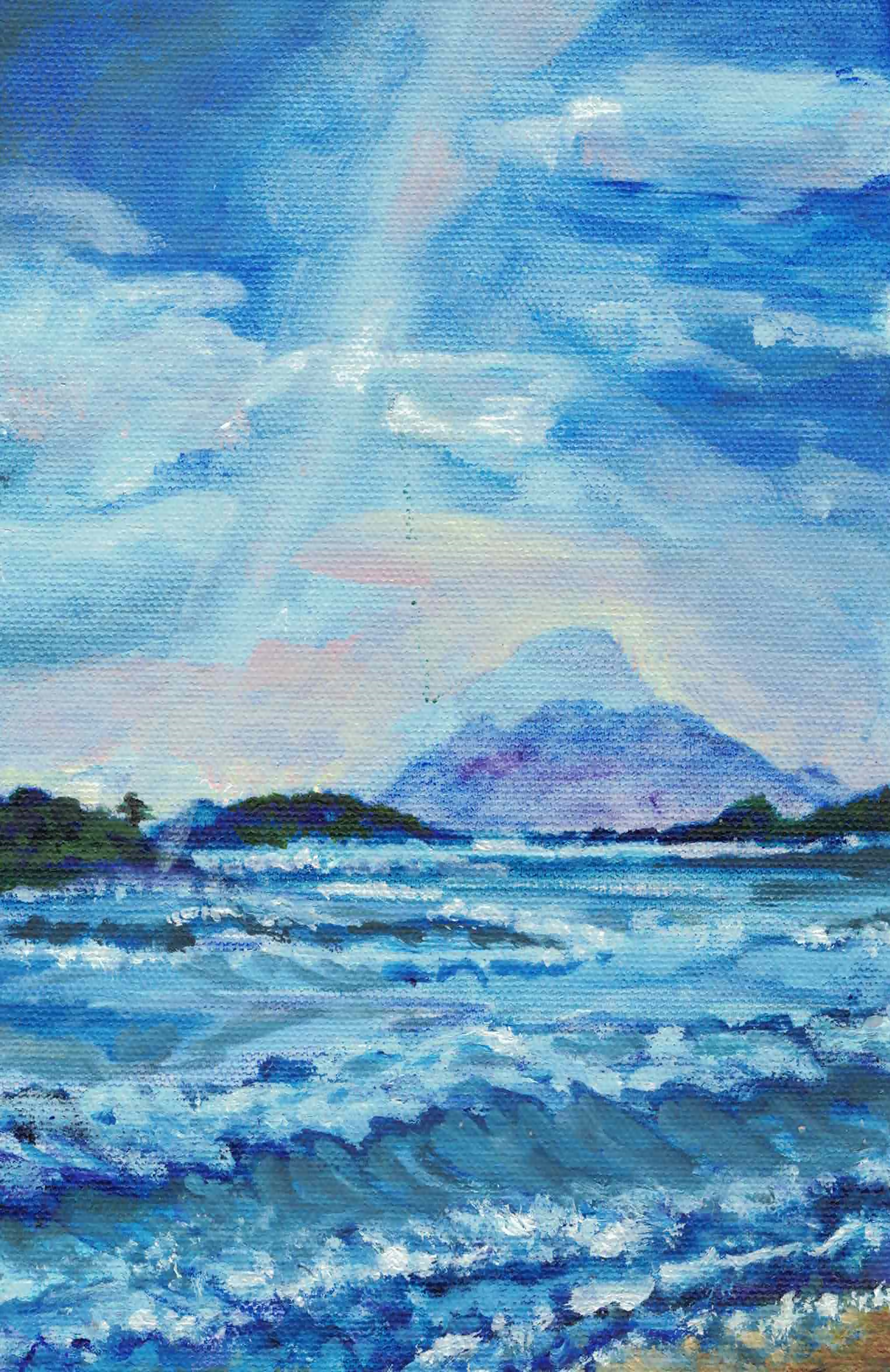 6"x 9" Mixed media, oil paint on canvas and wood with plastic tori. Shadow box painting from a photo taken at the ocean in Kamakura, Japan.