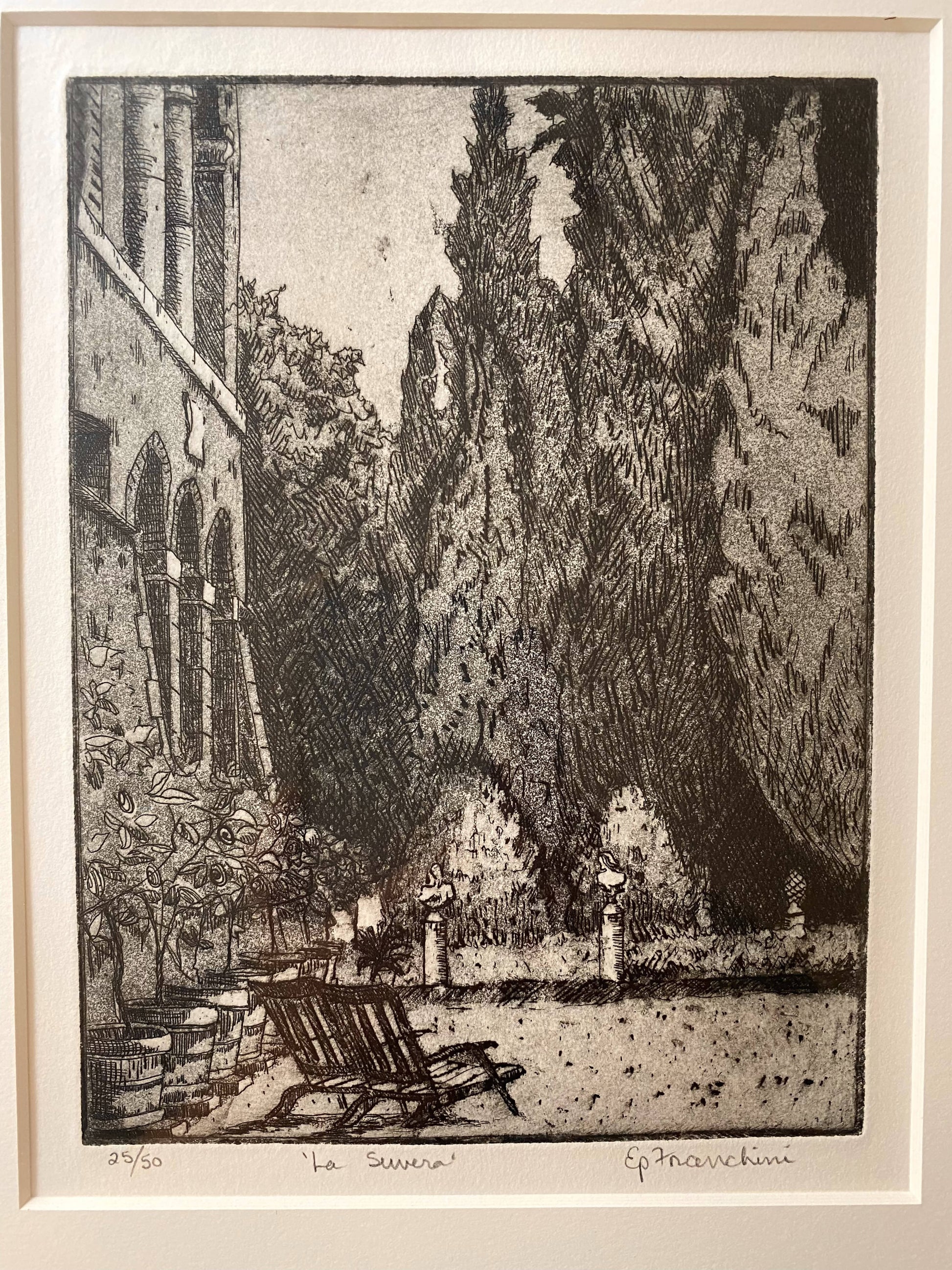16" x 14" framed Italian etching 'La Suvera' by Elisabetta Franchini. Signed and numbered limited edition of 50. Beautifully detailed antique silver frame.