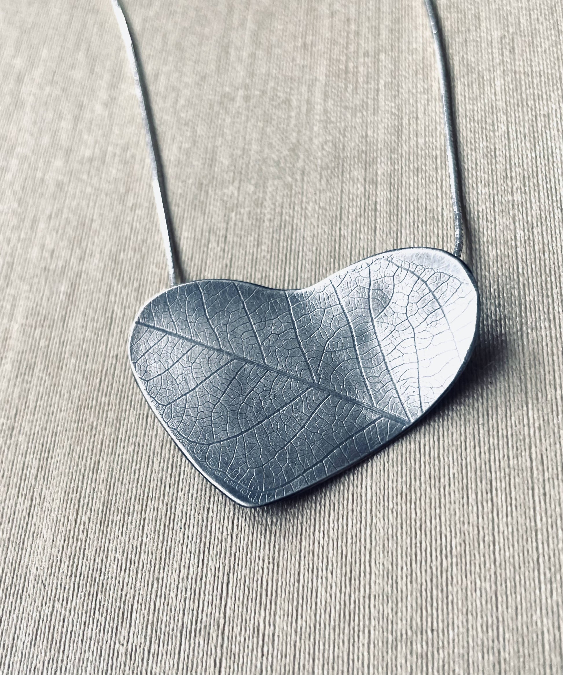 Hand pierced sterling silver heart pendant. Leaf texturized.