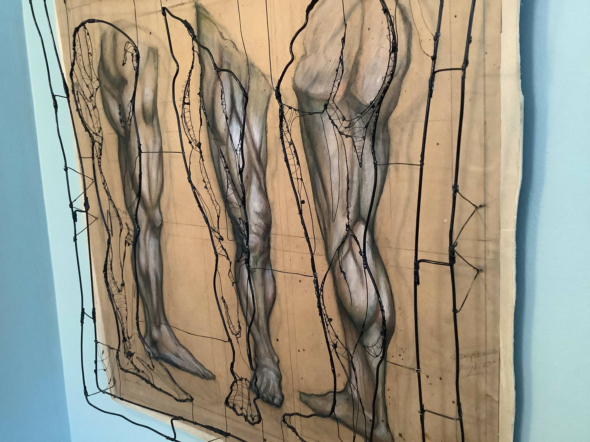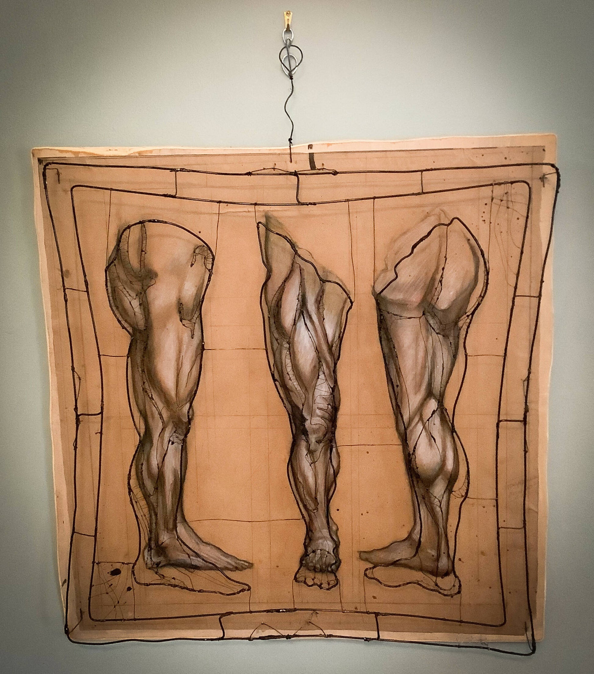 This "wall sculpture" echoes the classic work of Bregman, said to be the first to codify anatomy for artists. A wire structure "floats" an inch and a half above the oil pastel drawing to delineate the main lines of the composition and the contours of the muscles. A perfect gift for an artist, physician, massage therapist...or anyone with legs!