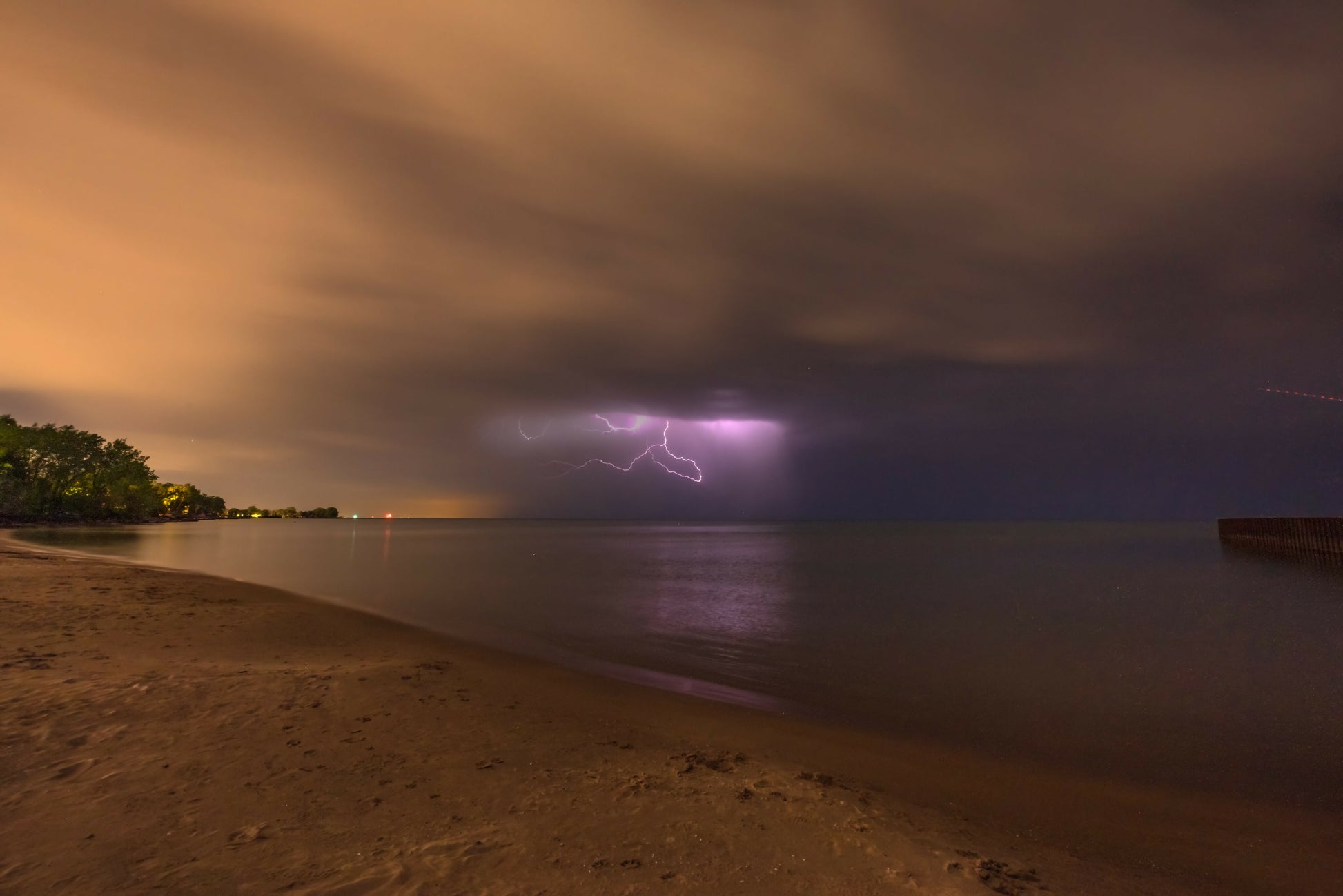 Thunder storms and lightning out over Lake Michigan from Lighthouse Beach.