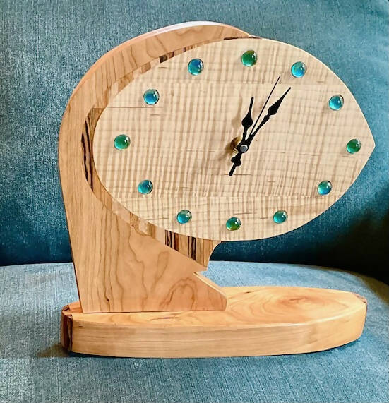 Black cherry (central Illinois) base and clock frame. Multi-wood face trim, curly maple clock face, marine green custom-fused glass beads. 11.25"L X 11"H X 3.5" D.