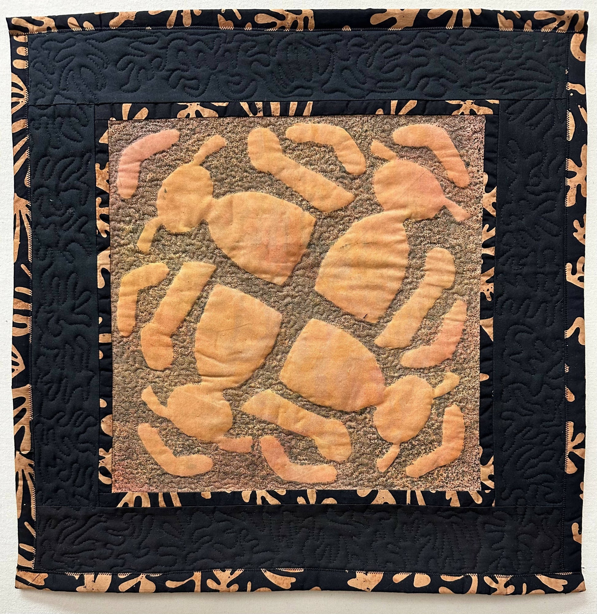 100% cotton, commercial and natural tannin dyed, textile paints, stencils, machine quilted. 18" x 18"