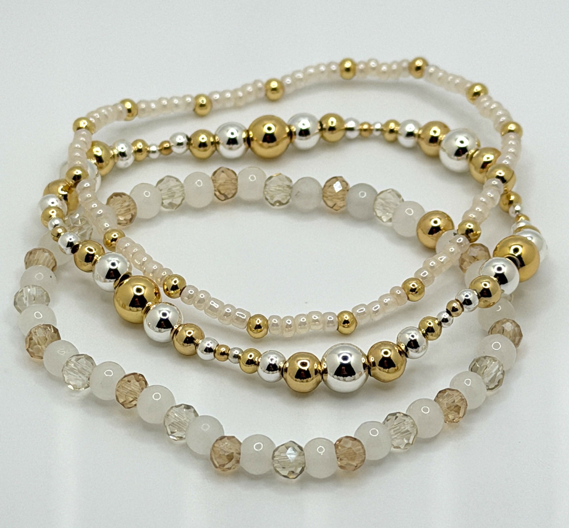 Add a touch of holiday sparkle to your wrist with this handcrafted trio. Made with high-quality glass beads, semi-precious stones, and gold-plated or sterling silver accents — never plastic or tarnishing metals — each bracelet is designed to mix, match, and shine all season long.
