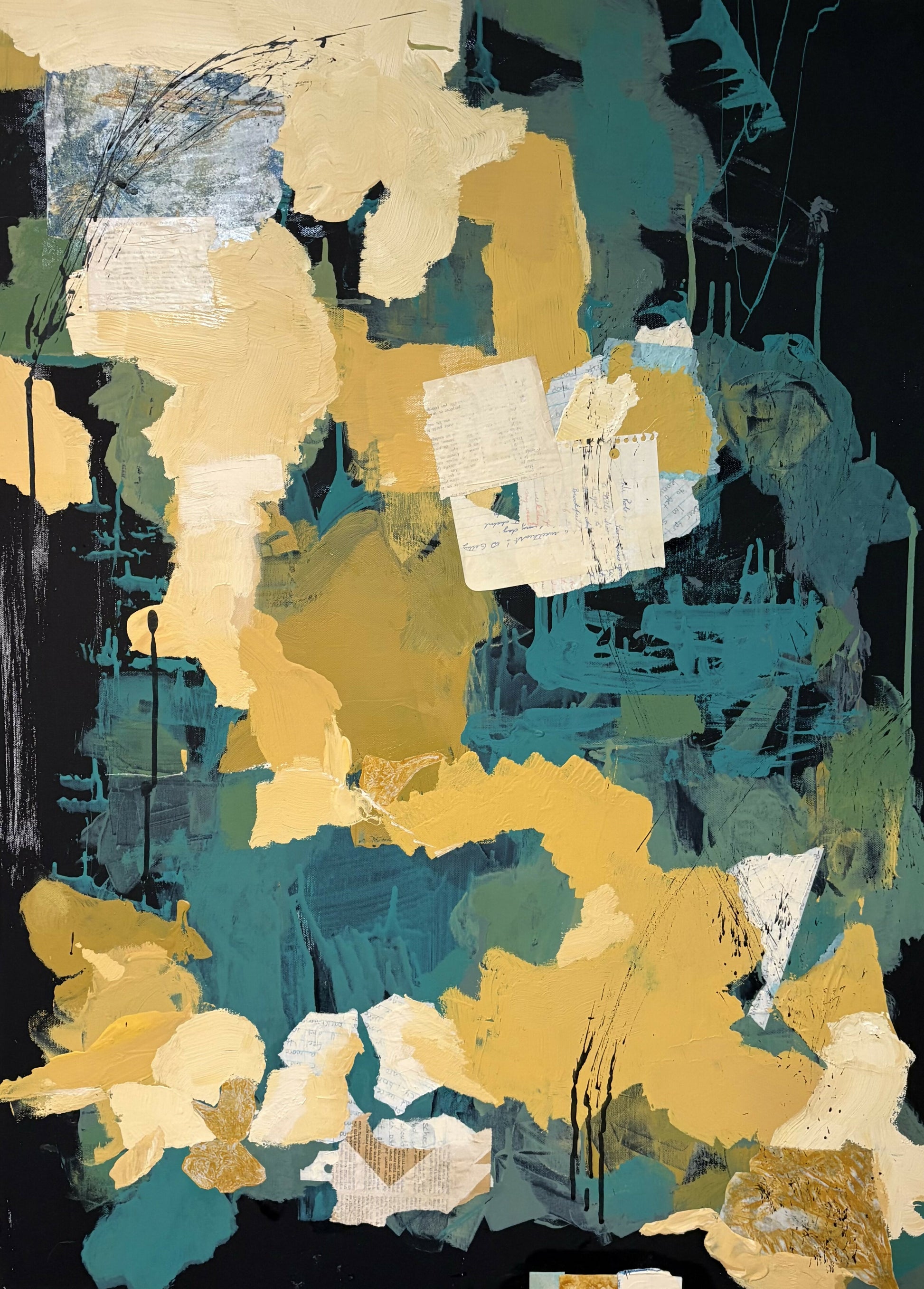 I decided to experiment, change things up and use black gesso as my first layer. From there, I experimented some more by using a new color for me, turquoise blue. The creamy yellow balanced the brightness of the blue and then I just started creating shapes and meandering. Because the colors were so different for me, I had a hard time knowing if I was done. I really had to sit with it and stare her down. I added some collage from old love letters and black India ink that I love applying with evergreen needles.