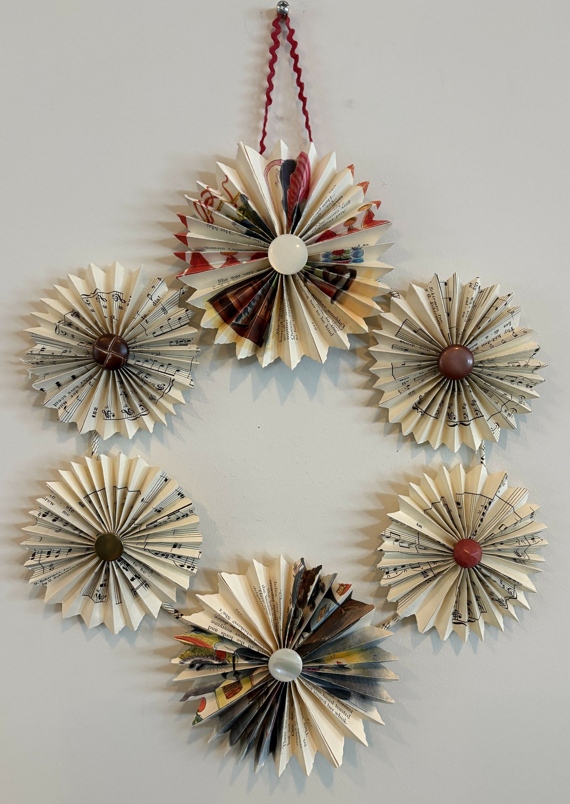 Designed using colorful book pages from a 1960’s collection of children’s stories, vintage sheet music and a beautiful fun mix of buttons. Mr Fezziwig is 16” x 12”. Completely made using upcycled recycled materials !