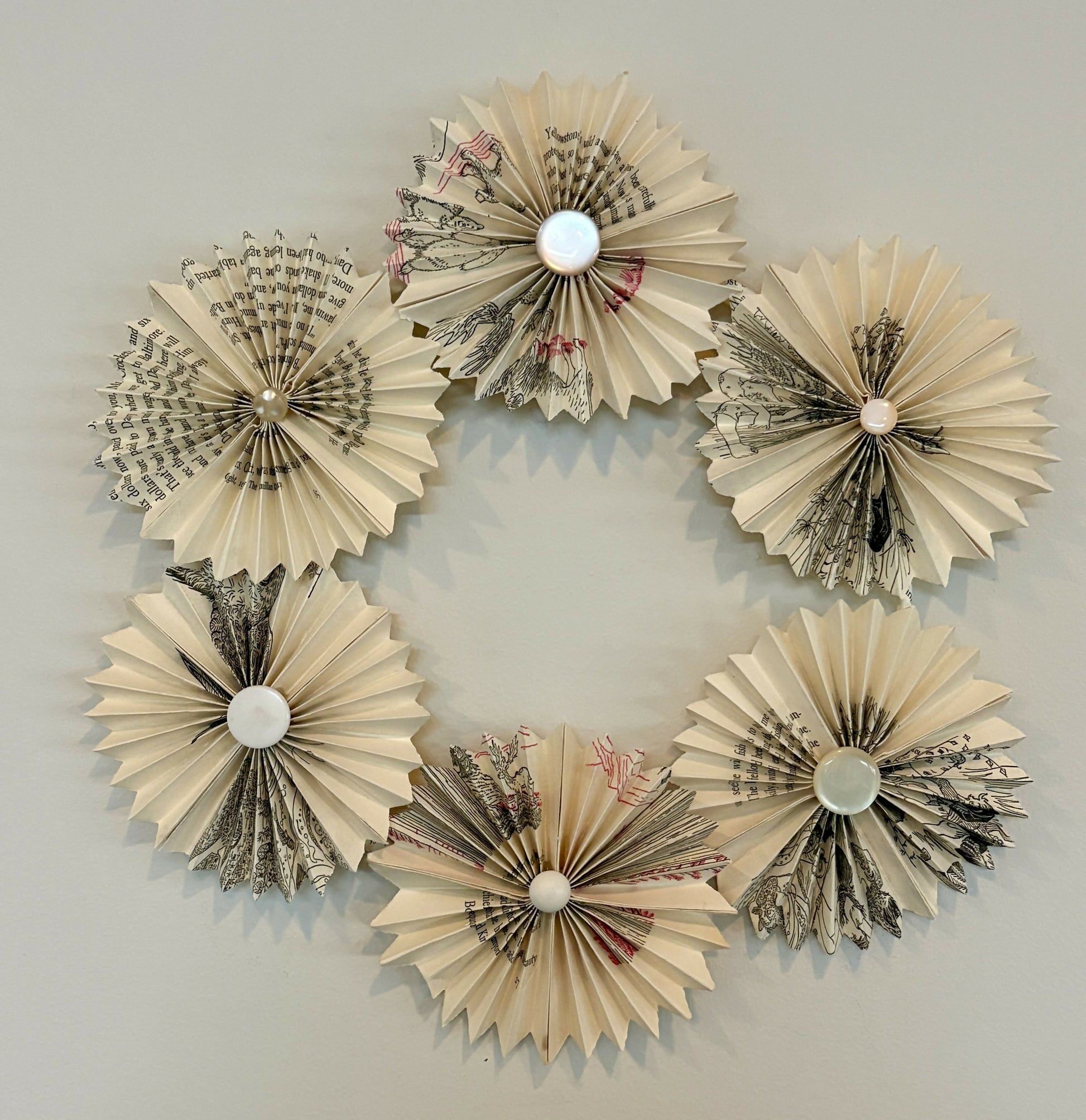 Mrs Doodlepunk was created using upcycled pages from a salvaged 1950’s children’s book, folded and trimmed into sweet little snowflakes and each one is topped with a pink or cream vintage button. Attached to an upcycled metal paper wrapped ring this little wreath is adorable. 11” x 11” Made from all Recycled Upcycled Sustainable materials.