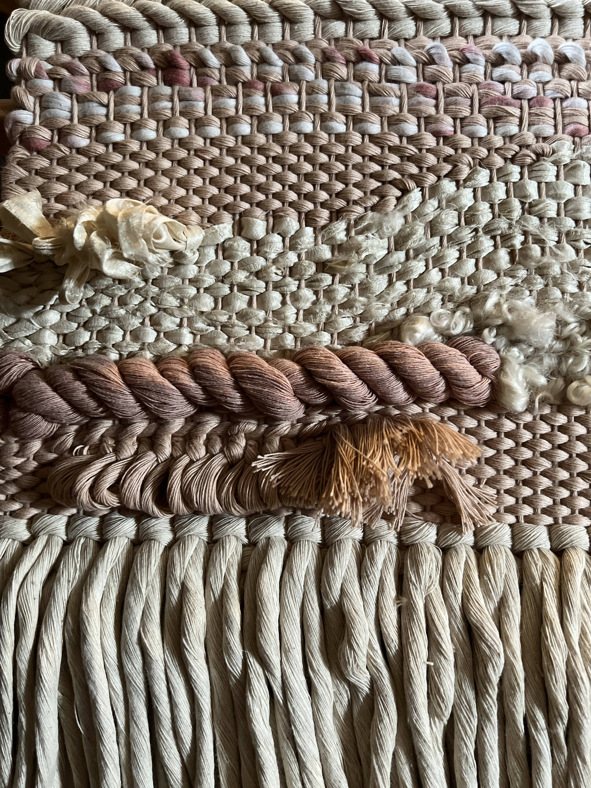Cotton rope and weaving in shades of cream and coral.