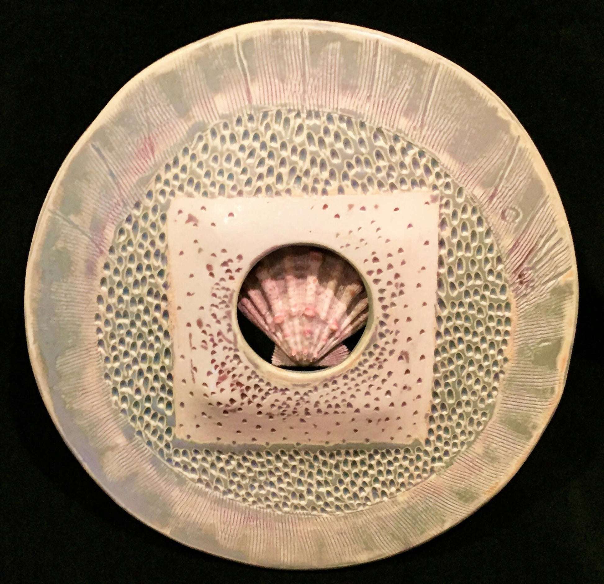 A unique ceramic wall piece with an unusual natural shell in the opening in the center. Custom wood mounting system. 12" diameter, 2" deep, wired for hanging