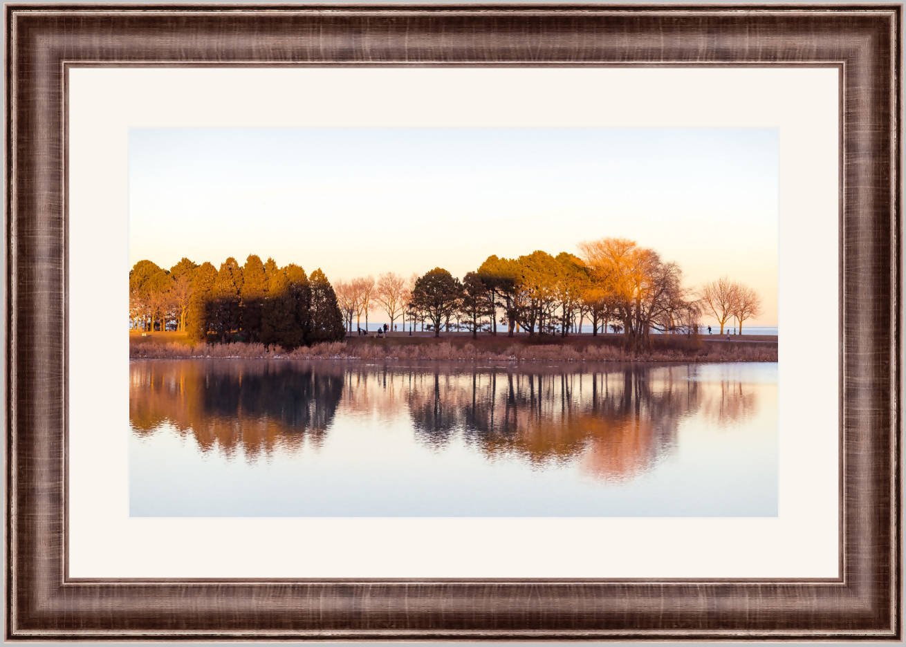 A serene and breathtaking view of trees reflecting on the water on Northwestern University's beloved lakefill, in a stunning 16x24 custom scoop frame with white mat.