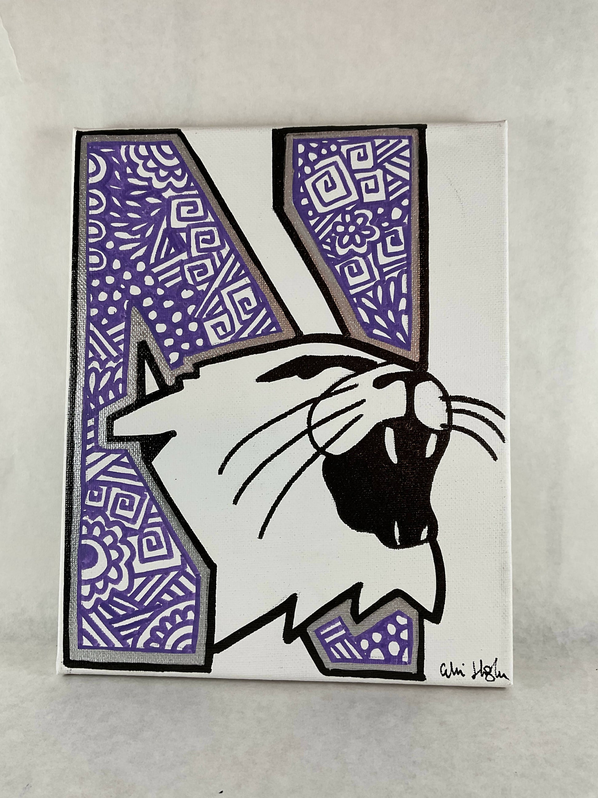 This is an original design acrylic painting on canvas. I have used Posca Acrylic Paint Markers to hand draw these flower and zentangle designs. The design features Northwestern and Wildcat. Canvases measure 8" x 10". Can be framed or displayed using an easel.